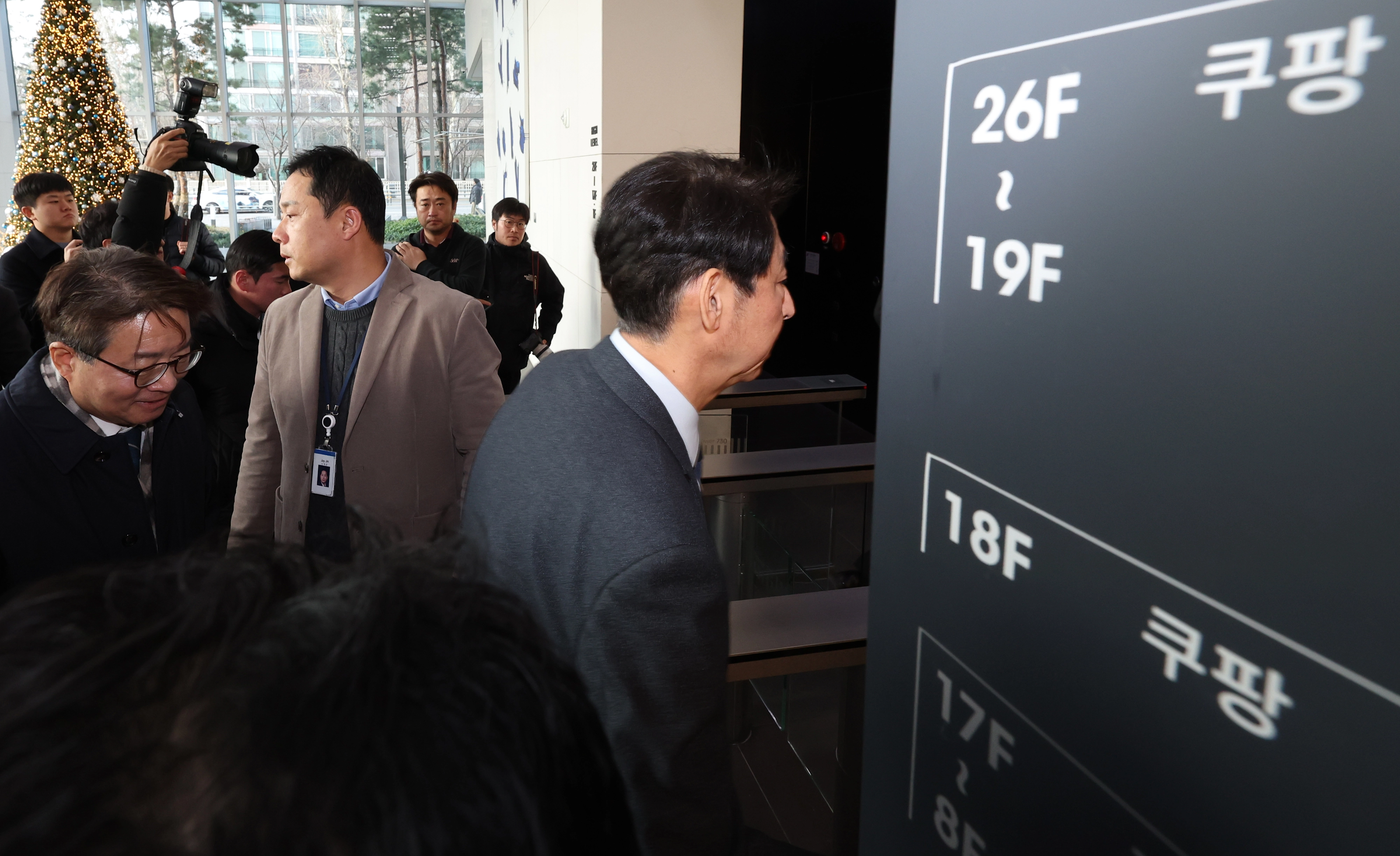 염태영(왼쪽 첫 번째), 이훈기(세 번째) 등 더불어민주당 을지키는민생실천위원회(을지로위원회) 의원들이 24일 서울 송파구 쿠팡 본사를 항의 방문하고 있다. 쿠팡은 지난달 말 3370만명의 대규모 개인정보 유출 사태가 알려진 이후 창업자 김범석 쿠팡Inc 의장이 국회 청문회 출석 요구에 응하지 않는 등 소극적 대응으로 비판받고 있다. 오는 30~31일 두 번째 국회 청문회가 예정된 상태다. 연합뉴스