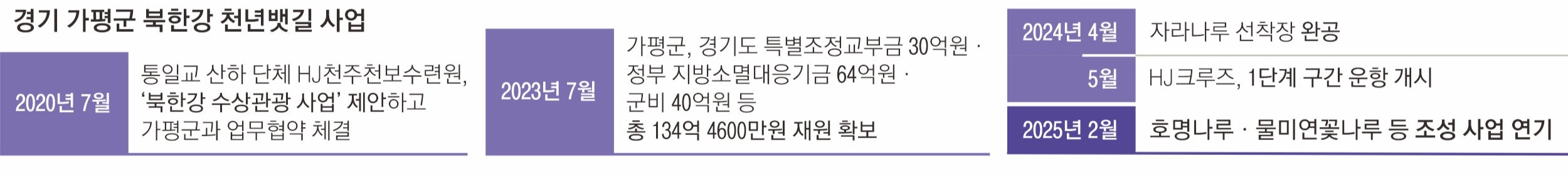 경기 가평군이 통일교 수익 사업으로 전락한 ‘북한강 천년뱃길’ 사업에 150억원을 투입하기로 하고 지금까지 65% 정도를 집행했지만 고작 4억원을 회수하는 데 그친 것으로 확인됐다. 해당 사업은 통일교 관련 단체가 먼저 제안했고 막대한 혈세가 들어갔지만, 가평군이 실제 사업에 행사할 수 있는 권한이 제한적이라 특혜를 제공했다는 의혹이 제기된다. 김건희 특검으로부터 통일교 관련 사건을 넘겨받은 경찰은 “다각도로 들여다보겠다”고 밝혔다.