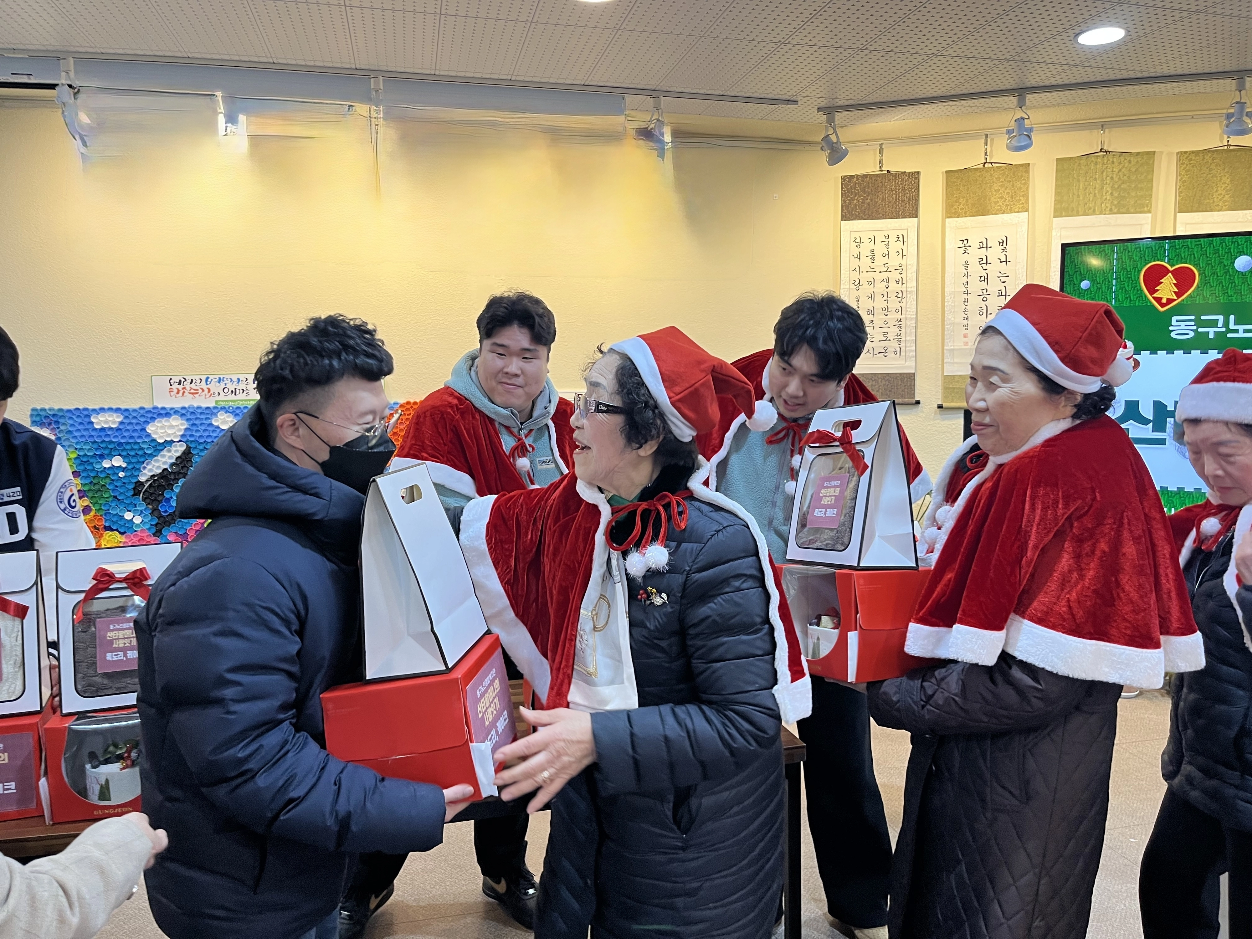 광주시 동구 노인들이 크리스마스 이브를 맞아 지역 장애인 이웃에게 따뜻한 정을 전하는 ‘산타할머니’로 변신했다.