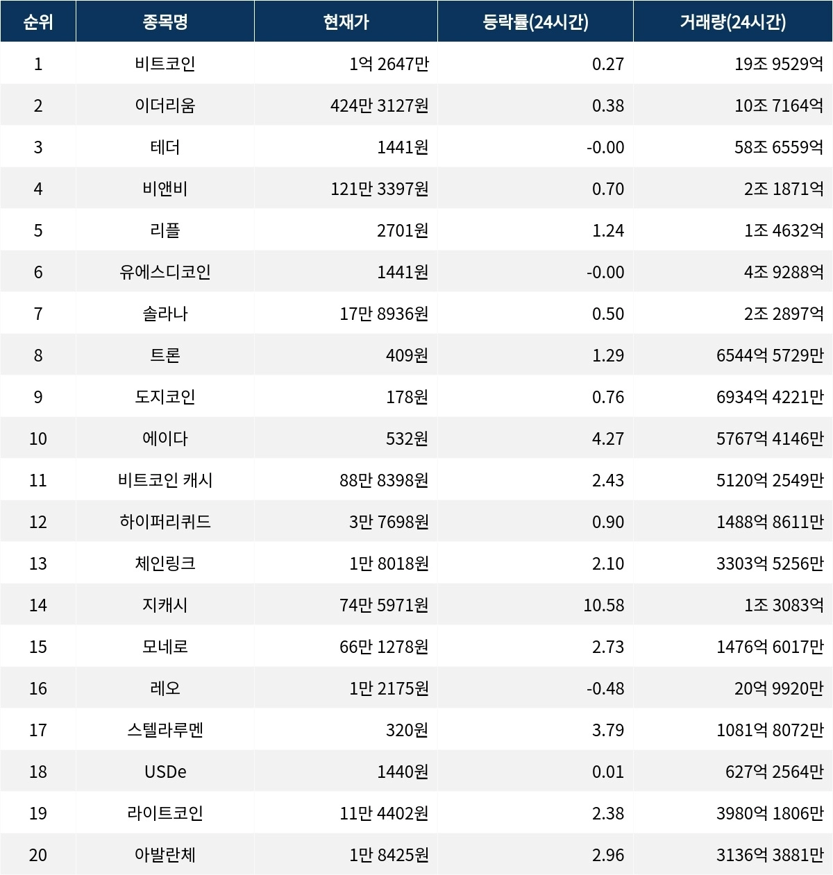 글로벌 가상자산 시황 중계 사이트 코인마켓캡(CoinMarketCap)에 따르면, 시가총액 상위 가상자산 중 비트코인은 현재가 1억 2647만 원, 시가총액 2525조 4388억 원을 기록하며 24시간 동안 0.27% 상승했다. 비트코인의 1시간 등락률은 -0.07%로, 단기적으로 하락세로 전환될 수 있는 가능성이 있다. 이더리움은 현재가 424만 3127원, 시가총액 512조 1240억 원이며 24시간 동안 0.38%의 상승세를 보였다. 1시간 등락률은 -0.13%로, 이더리움도 단기적으로 하락할 가능성이 엿보인다. 리플은 현재가 2701원, 시가총액 163조 6487억 원으로 24시간 동안 1.24% 상승했으며, 1시간 등락률은 0.04%로 상승세를 이어갈 가능성이 높다.