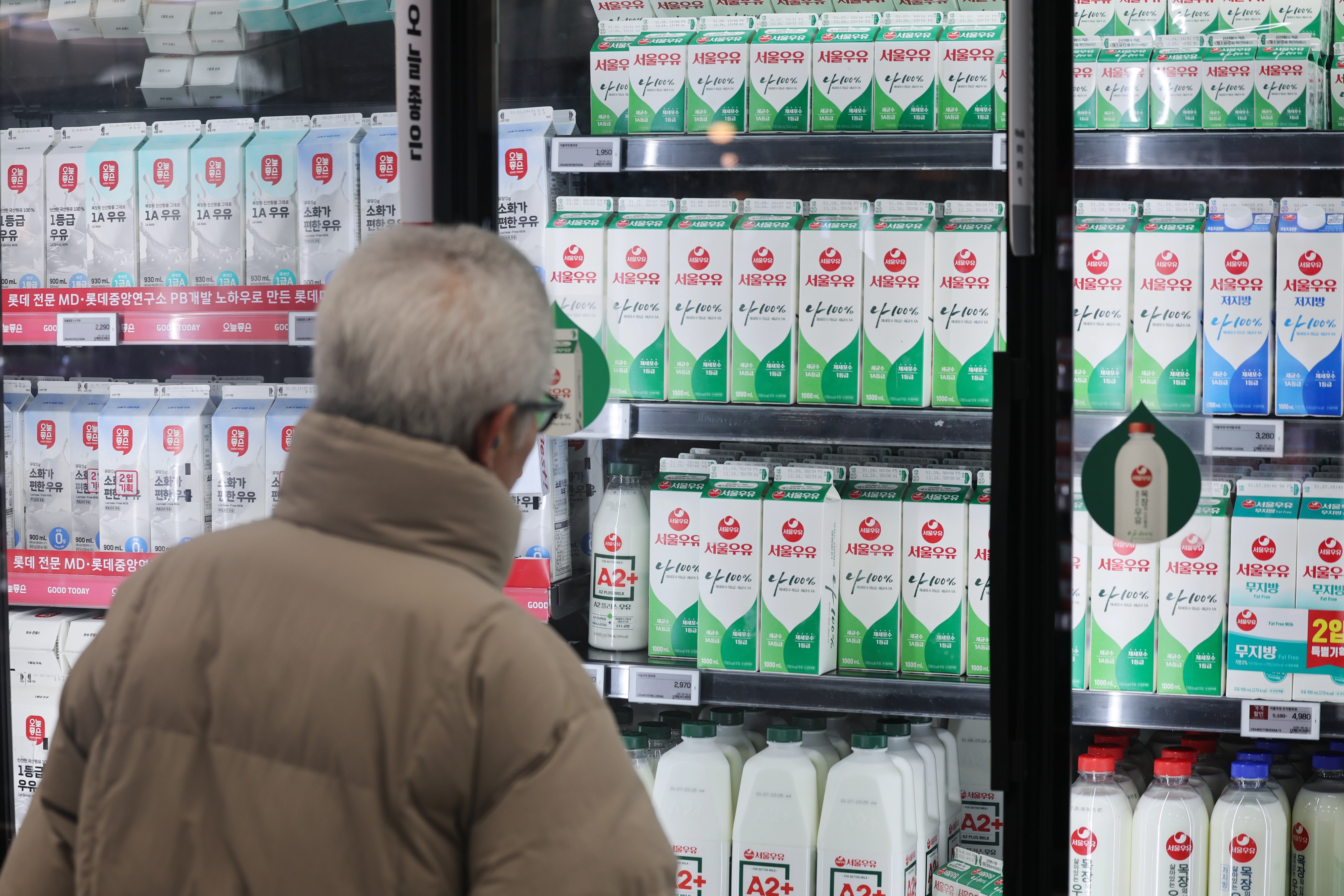 소비자가 28일 서울 시내의 한 대형마트에 진열된 우유를 쳐다보고 있다. 이마트는 올해 들어 지난달까지 품목별 매출 순위를 집계한 결과, 저출산에 따라 학령기 인구가 감소하면서 우유는 지난해 7위에서 9위로 하락한 반면 건강 관리 식품으로 인식된 요구르트(요거트 포함)는 처음으로 10위에 올랐다고 전했다.