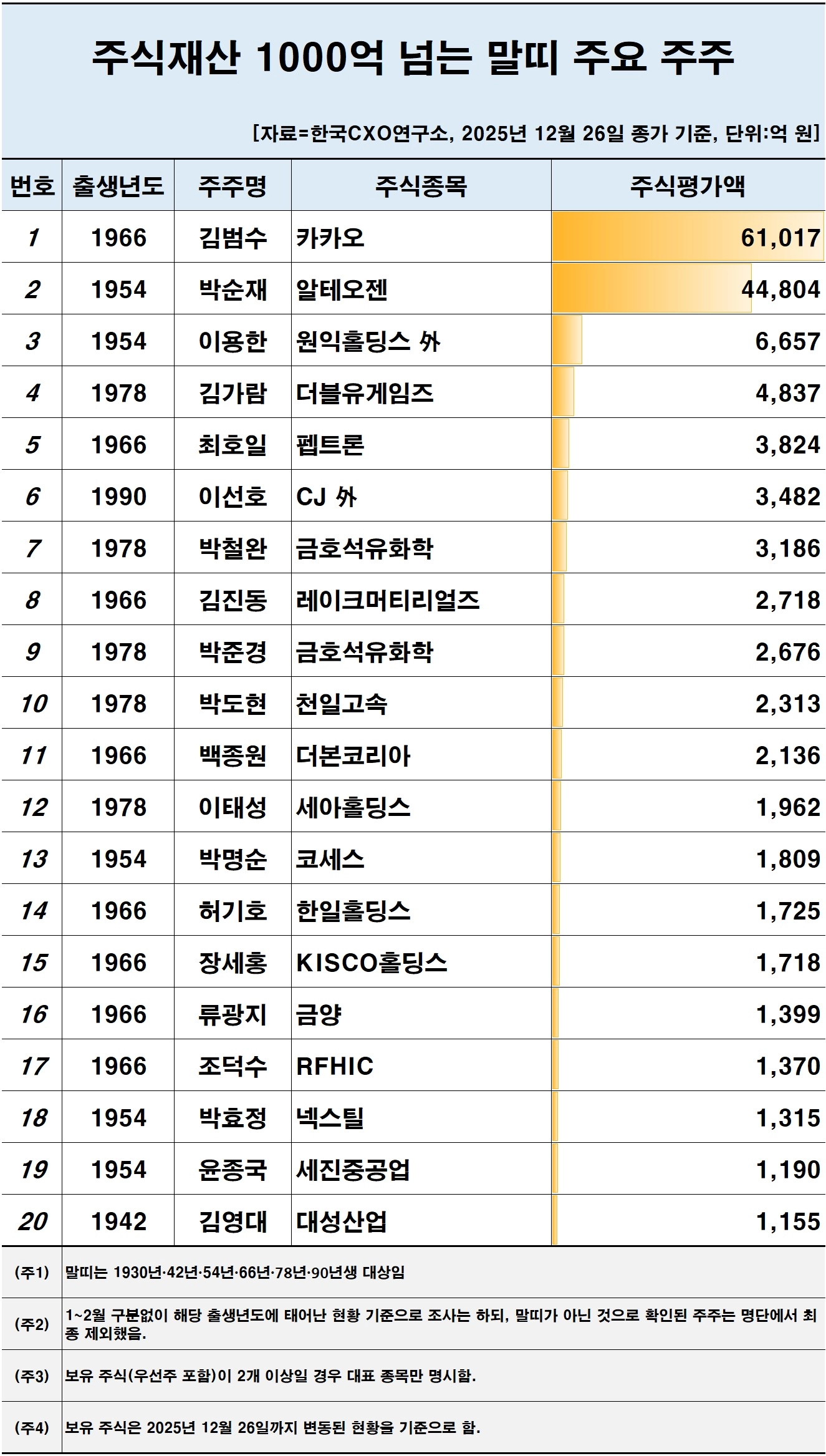 ‘1조원 말띠’엔 카카오 김범수·알테오젠 박순재