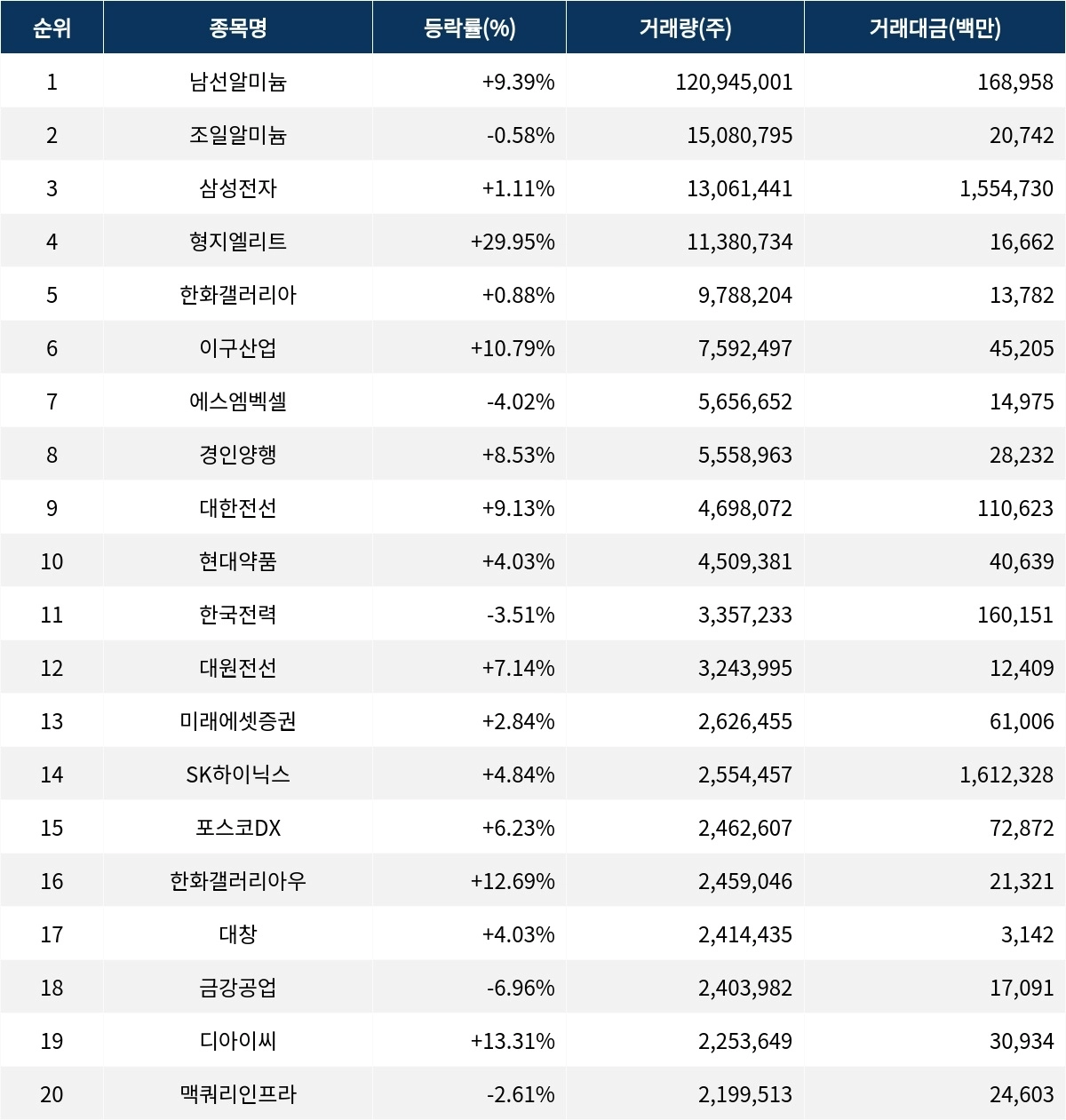 한편 거래량 상위 20위권 종목들은 한국전력(015760) ▼3.51%, 대원전선(006340) ▲7.14%, 미래에셋증권(006800) ▲2.84%, SK하이닉스(000660) ▲4.84%, 포스코DX(022100) ▲6.23%, 한화갤러리아우(45226K) ▲12.69%, 대창(012800) ▲4.03%, 금강공업(014280) ▼6.96%, 디아이씨(092200) ▲13.31%, 맥쿼리인프라(088980) ▼2.61% 등의 성적을 기록한다.