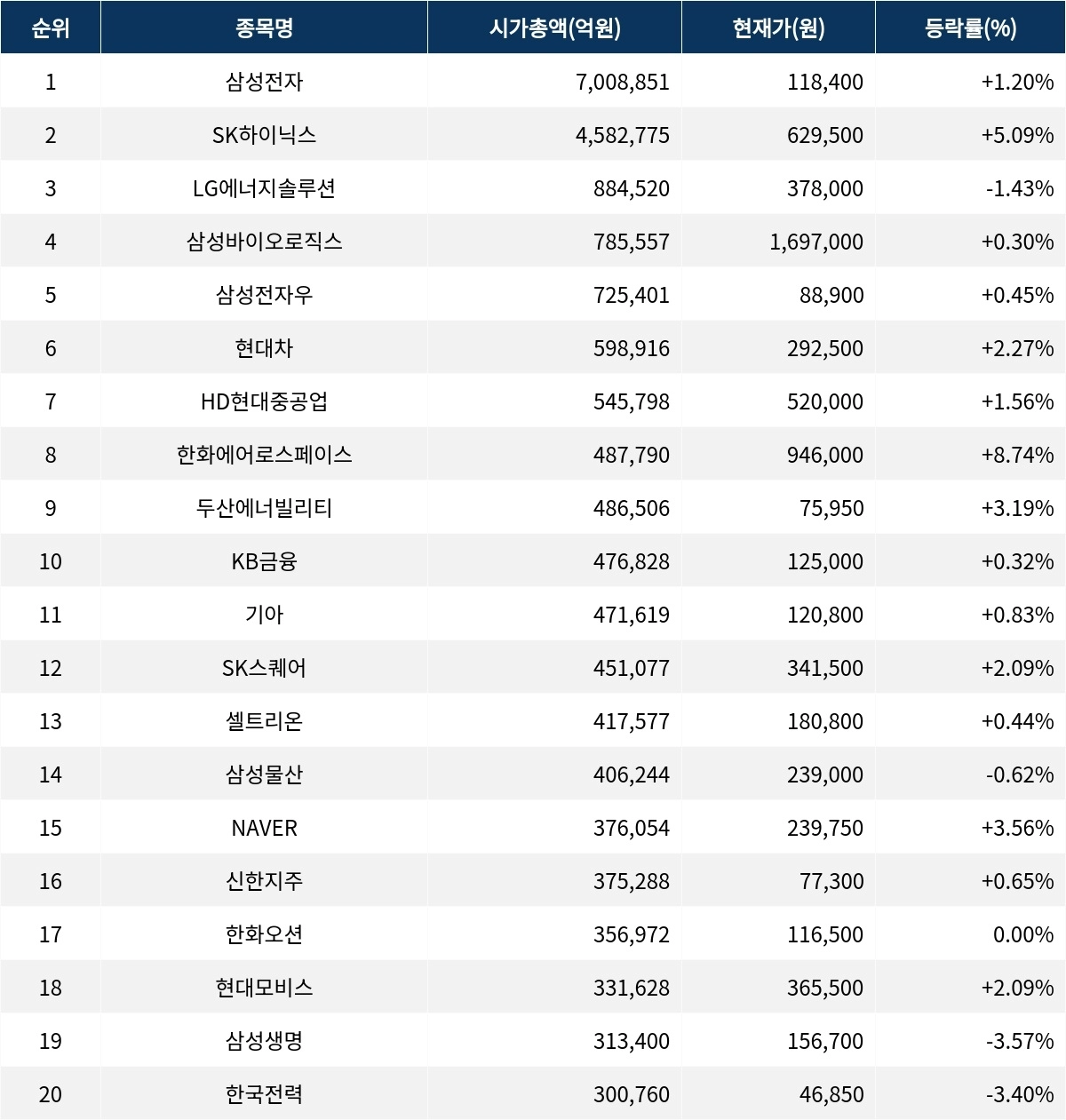 한편 시가총액 20위권 종목들은 기아(000270) ▲0.83%, SK스퀘어(402340) ▲2.09%, 셀트리온(068270) ▲0.44%, 삼성물산(028260) ▼0.62%, NAVER(035420) ▲3.56%, 신한지주(055550) ▲0.65%, 한화오션(042660) 0.00%, 현대모비스(012330) ▲2.09%, 삼성생명(032830) ▼3.57%, 한국전력(015760) ▼3.40% 등의 성적을 기록하고 있다.