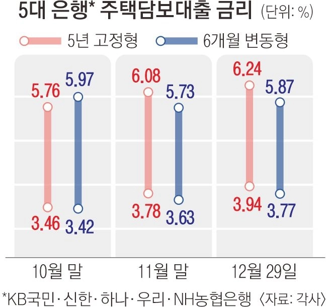 29일 은행권에 따르면 이날 기준 5대 시중은행(KB국민·신한·하나·우리·NH농협은행)의 고정형 주담대 금리는 연 3.94~6.24%를 기록했다. 지난 11월 말(3.78~6.08%)과 비교해 상·하단이 각각 0.16% 포인트씩 뛰었다. 6개월마다 금리가 바뀌는 변동형 주담대 금리 역시 전월 말 대비 상·하단이 모두 올라 이날 기준 3.77~5.87%로 상단이 6%에 근접했다.