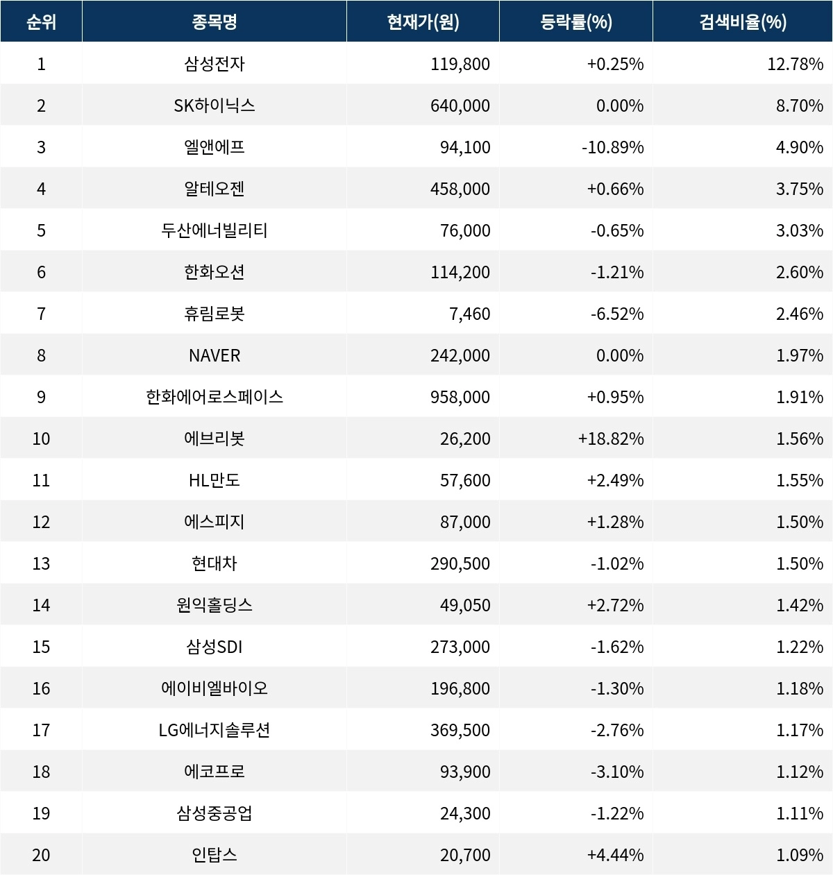 이어 SK하이닉스(000660)가 검색비율 2위를 기록하며 0.00%의 보합세를 보이고 있다. 검색비율 3위의 엘앤에프(066970)는 10.89% 하락하며 주가가 큰 폭으로 하락 중이다. 검색비율 4위 알테오젠(196170)은 개장 초반부터 0.66%의 상승세를 보이고 있다. 검색비율 5위 두산에너빌리티(034020)는 0.65% 하락하며 약세를 보이고 있다.