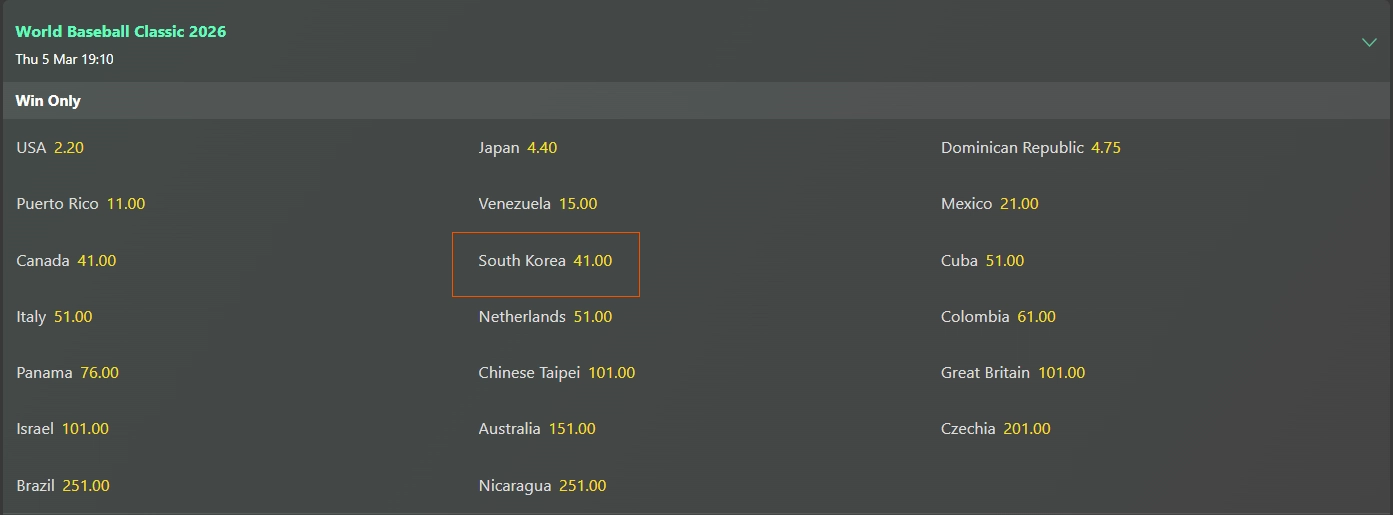 30일 윌리엄힐, 벳365, 드래프트킹 등 주요 베팅 사이트에 따르면, 한국 야구 대표팀은 사이트 대부분에서 8위 안에 들었다. 윌리엄힐(25/1)과 드래프트킹(+3500)에서 단독 7위였고, 벳365에서도 41대1로 캐나다와 함께 공동 7위에 올랐다.