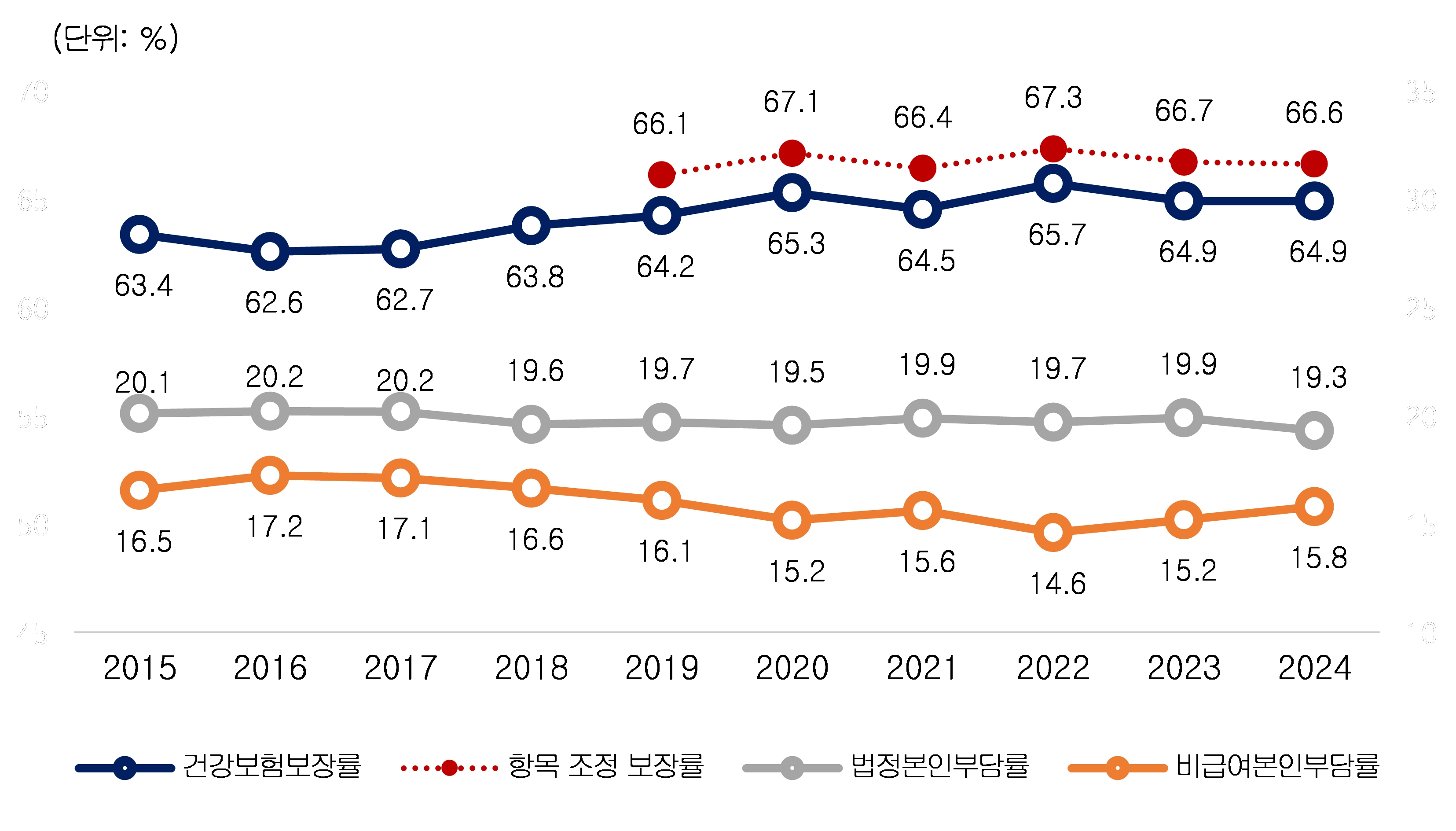한국의 건강보험 보장률이 수년째 정체 상태를 벗어나지 못하고 있다. 30일 국민건강보험공단에 따르면 전체 의료비 가운데 건강보험이 부담하는 비율을 뜻하는 건강보험 보장률은 2024년 기준 64.9%로 전년과 같은 수준에 머물렀다. 역대 정부가 국민 의료비 부담 완화를 목표로 보장성 강화 정책을 추진해왔지만, 여전히 경제협력개발기구(OECD) 평균인 76.3%를 크게 밑돈다.