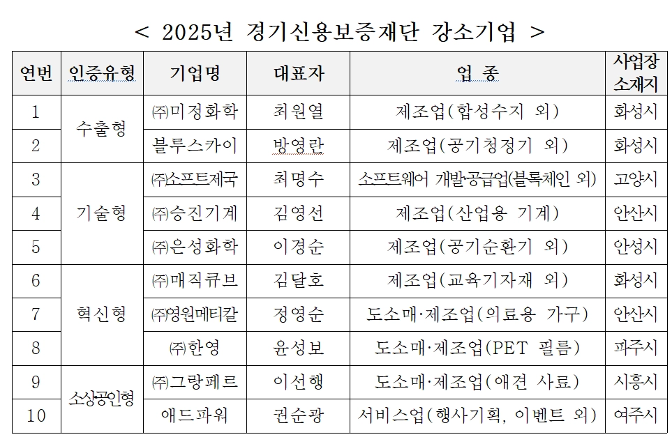 경기신용보증재단(경기신보)은 어려운 경제 여건 속에도 기술력과 혁신 역량을 바탕으로 위기를 기회로 바꿔온 ‘강소기업’ 10곳을 30일 선정했다고 밝혔다. 재단은 폐업과 위기, 생존의 두려움이라는 상황 속에서 묵묵히 경쟁력을 키워온 사례를 발굴·조명함으로써, 중소기업과 소상공인에 대한 인식을 개선하고 현장에 실질적인 격려와 자신감을 알리기 위해 경기도 강소기업 선정을 추진했다.