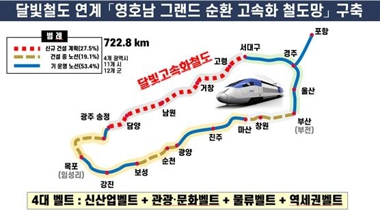 30일 대구정책연구원의 ‘대구-광주 달빛철도 연계 영호남 순환 고속화 철도망 사업’ 연구 결과에 따르면 연구진은 달빛고속화철도를 기반으로 영호남 전역을 순환하는 고속화 철도망을 구축하면 남부거대경제권 형성이 현실화 될 것으로 전망했다. 서대구역과 광주송정역을 잇는 198.8㎞의 달빛고속화철도는 사업비 6조400억원 규모로 2030년 개통을 목표로 정부의 예비타당성조사 면제가 추진 되고 있다.