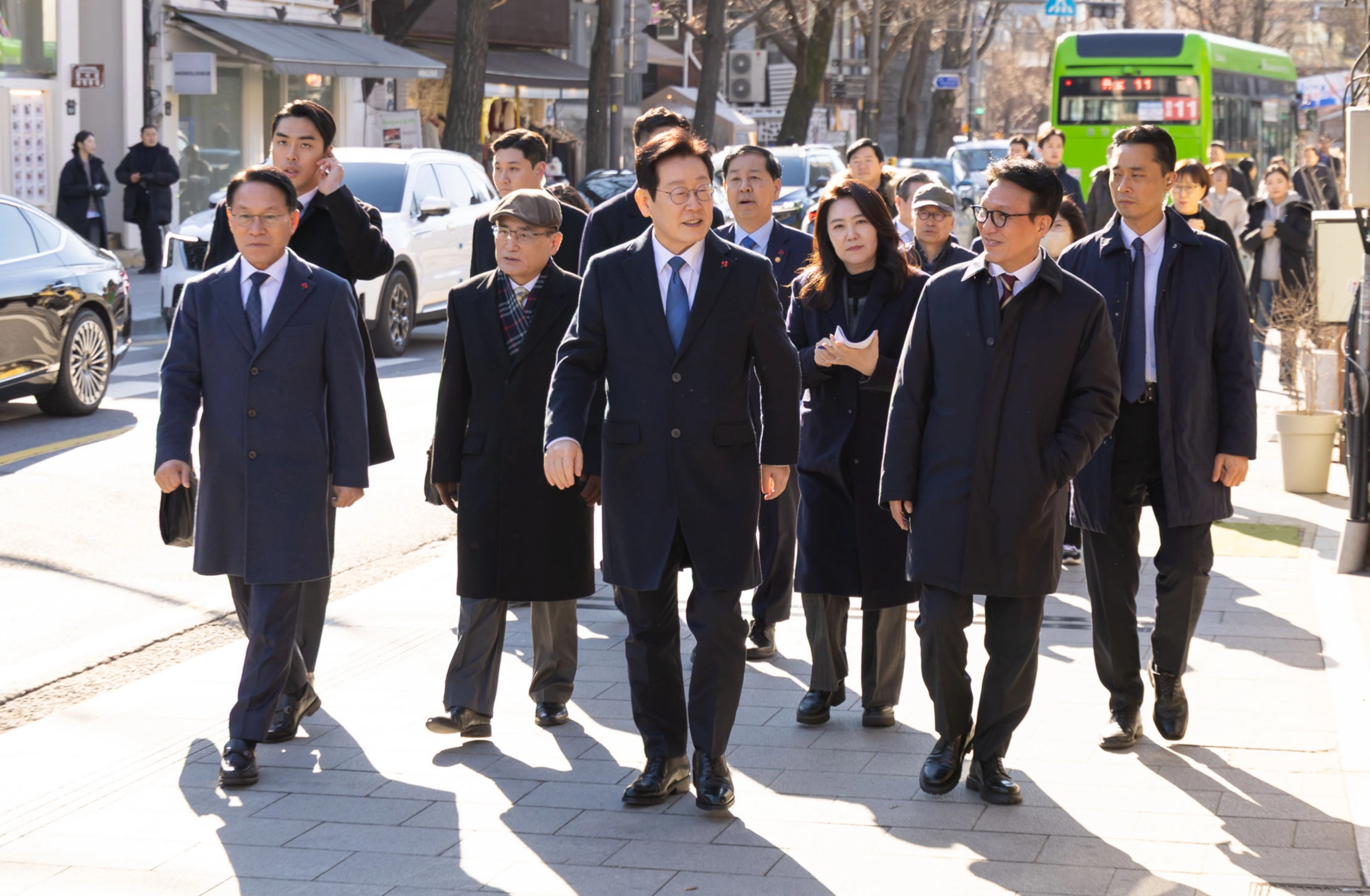 이재명 대통령이 30일 김민석 국무총리, 구윤철 경제부총리 겸 기획재정부 장관, 위성락 안보실장 등 국무회의 참석자들과 오찬을 하기 위해 서울 삼청동 길을 걷고 있다. 2025.12.30 청와대 제공