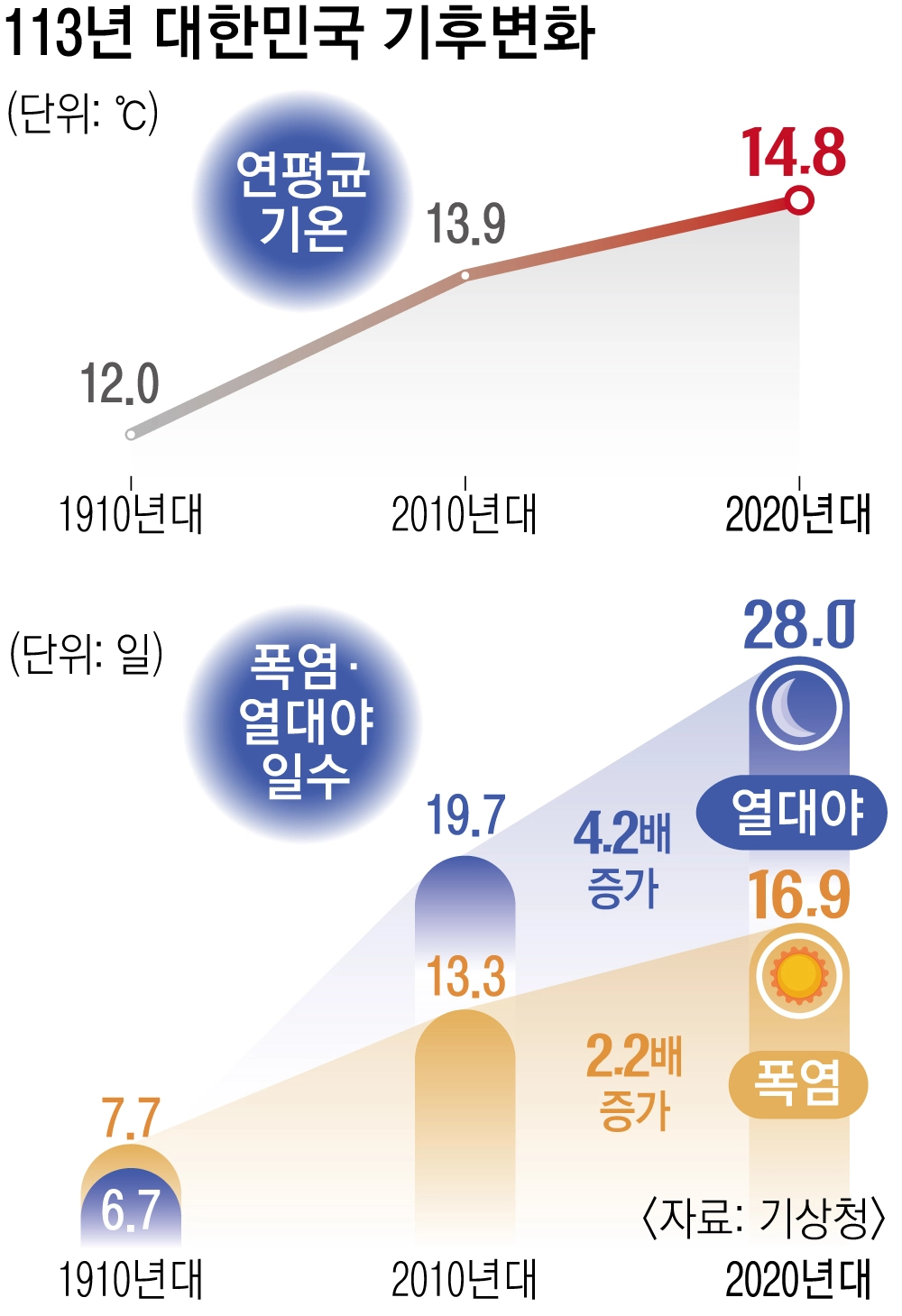 지구온난화의 영향으로 우리나라 기후가 113년 전과 비교해 폭염일수가 2.2배, 열대야 일수가 4.2배 증가한 것으로 나타났다. 특히 최근 10년 사이의 기온 상승 폭이 지난 한 세기 전체 상승량의 절반에 육박할 만큼 가팔라지면서 한반도 기후변화에 가속도가 붙었다는 분석이 나온다.