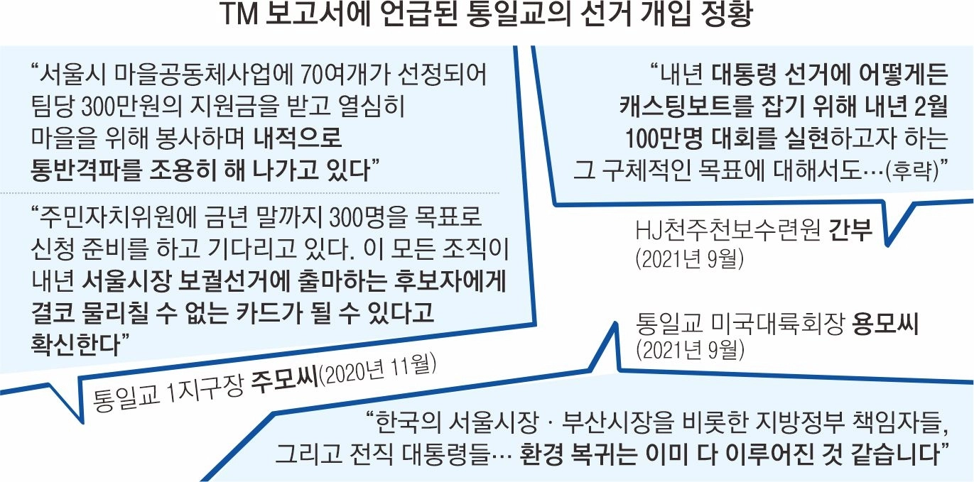 한편 이날 서울신문이 입수한 ‘TM(True Mother·참어머니) 특별보고’ 문건의 2020년 11월 보고에는 당시 통일교 1지구장을 맡았던 주모씨가 “1지구는 서울시 마을공동체사업에 70여개가 선정돼 팀당 300만원의 지원금을 받고 내적으로 통반격파(가정 중심 사회변화 운동)를 조용히 해나가고 있다”고 설명한 부분이 포함됐다. 이어 “모든 조직이 내년 서울시장 보궐선거에 출마하는 후보자에게 결코 물리칠 수 없는 카드가 될 수 있다고 확신한다”고 밝혔다.