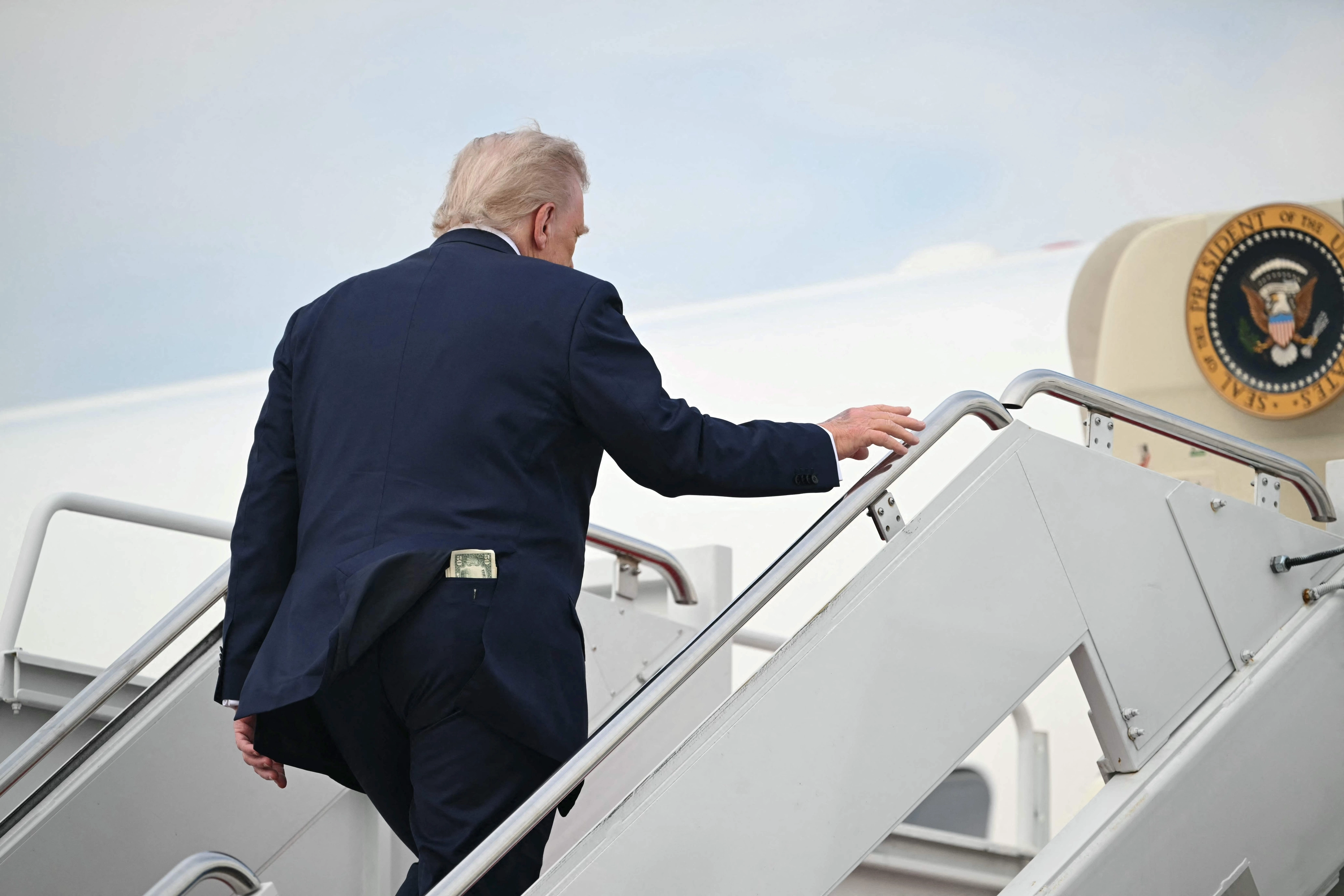 성공한 사업가 출신의 도널드 트럼프 미국 대통령이 절치부심 끝에 백악관에 재입성한 지 1년이 돼 가고 있다. 사진은 지난 5월 1일 메릴랜드주 앤드루스 공군기지에서 전용기에 오르는 트럼프 대통령의 뒷모습으로, 뒷주머니에 50달러 지폐가 보인다. AFP 연합뉴스