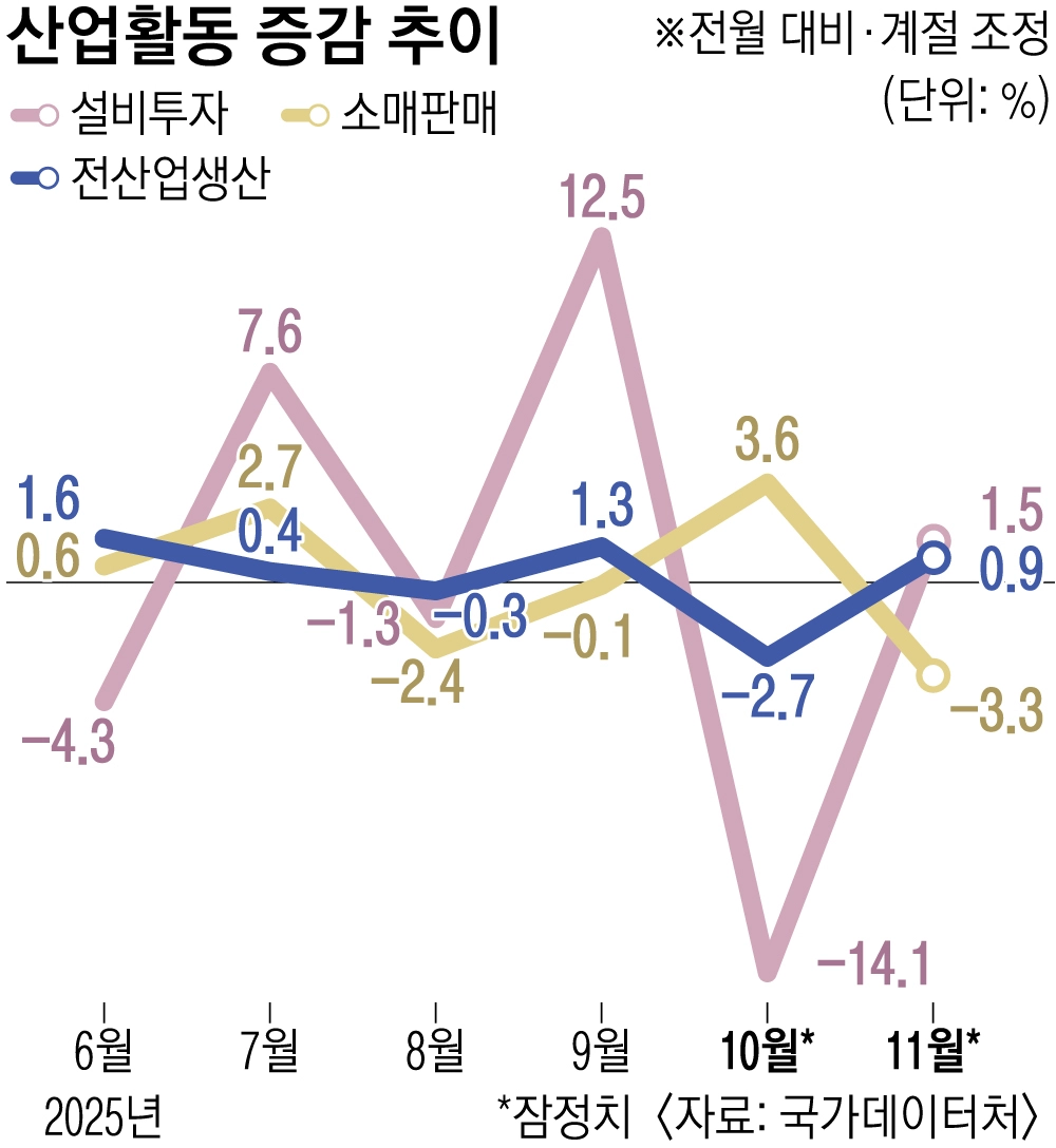 연평균 역대 최고 수준의 고환율 상황이 이어지며 소비심리가 꽁꽁 얼어붙었다. 반면 인공지능(AI) 산업에 대한 기대감으로 반도체 수요가 증가하면서 생산과 투자는 반등하며 온기가 도는 모습이다. 국가데이터처가 30일 발표한 ‘11월 산업활동동향’에 따르면 소비 동향을 보여주는 소매판매액 지수는 지난달보다 3.3% 감소했다. 지난해 2월 -3.5% 이후 1년 9개월 만의 최대 감소 폭이다. 소매판매는 지난 8월 2.4%, 9월 0.1% 감소한 뒤 10월에 3.6%로 반짝 상승했다가 다시 감소세로 전환됐다.
