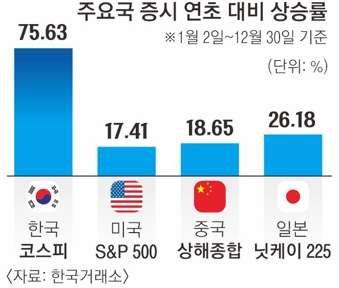 다만 연간 성과로 보면 올해 국내 증시는 ‘사상 첫 사천피(4000)’ 시대를 열며 기록적인 한 해를 보냈다. 특히 코스피는 연초 2399.49에서 이날 4214.17까지 75.63% 상승해 주요 20개국(G20)이나 경제개발협력기구(OECD)에 포함된 총 46개국 지수 중 가장 높은 수익률을 기록했다. 원화 강세와 ‘3저 호황’이 나타났던 1987년, 정보통신(IT) 버블 시기였던 1999년에 이어 역대 세 번째로 높은 연간 상승률이다. 같은 기간 미국·중국·일본 등 주요국 증시가 10~20%대 상승에 그친 것과 대조적이다.