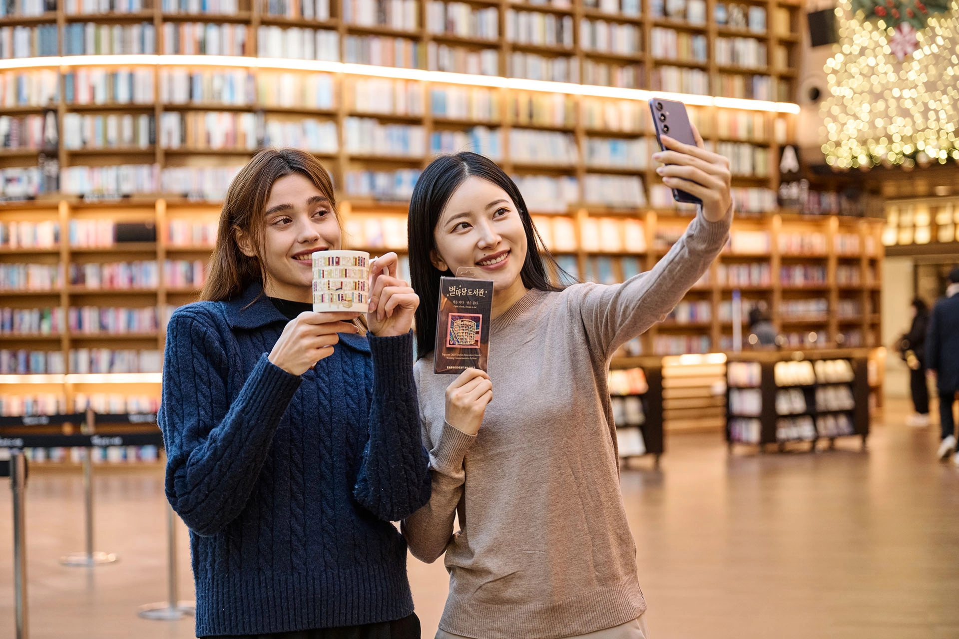 스타필드 코엑스몰 별마당 도서관이 글로벌 여행 플랫폼 트립닷컴 그룹의 ‘2025 관광혁신상’ 수상을 기념해 별마당 도서관의 공간 경험을 담은 머그컵·그릇·노트 등 굿즈 7종을 선보일 예정인 가운데 30일 별마당 도서관에서 모델들이 특별 굿즈를 들고 기념 사진을 촬영하고 있다. 신세계프라퍼티 스타필드 제공