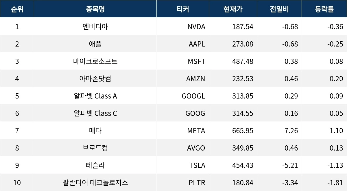 엔비디아는 전일 대비 0.36% 하락한 187.54달러로 마감했다. 애플은 0.25% 하락하여 273.08달러에 거래를 마쳤다. 마이크로소프트는 0.08% 상승하며 487.48달러에 거래를 마쳤다.