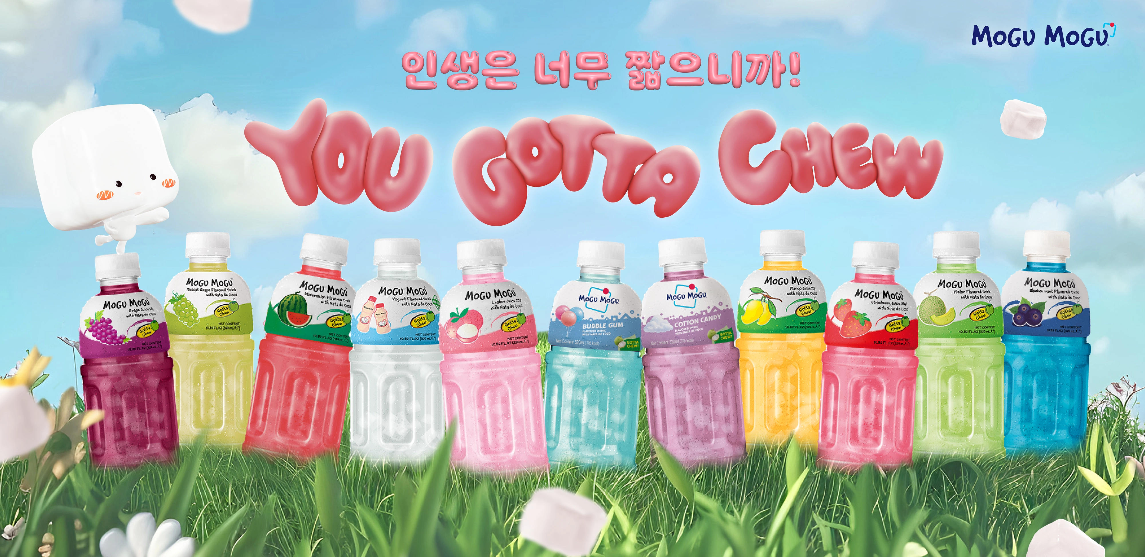 모구모구는 ‘You Gotta Chew(씹어야 진짜 즐겁다)’라는 슬로건을 바탕으로 전 세계 100개국 이상에서 사랑받으며 스낵형 음료 카테고리의 선구자로 자리 잡았다. 브랜드명 자체가 일본어 ‘오물오물, 냠냠’에서 유래했듯이, 모구모구는 큼직하고 쫄깃한 나타드코코 식감을 통해 ‘마시고 씹는 즐거움(Drink & Chew)’을 극대화한다.
