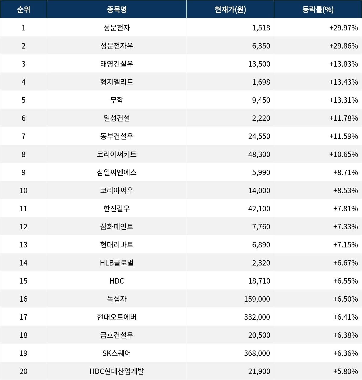 6위 일성건설(013360)은 2,220원으로 11.78% 급등 마감했다. 7위 동부건설우(005965)는 종가 24,550원으로 11.59% 급등 마감했다. 8위 코리아써키트(007810)는 종가 48,300원으로 10.65% 상승 마감했다. 9위 삼일씨엔에스(004440)는 5,990원으로 8.71% 상승 마감했다. 10위 코리아써우(007815)는 14,000원으로 8.53% 상승 마감했다.