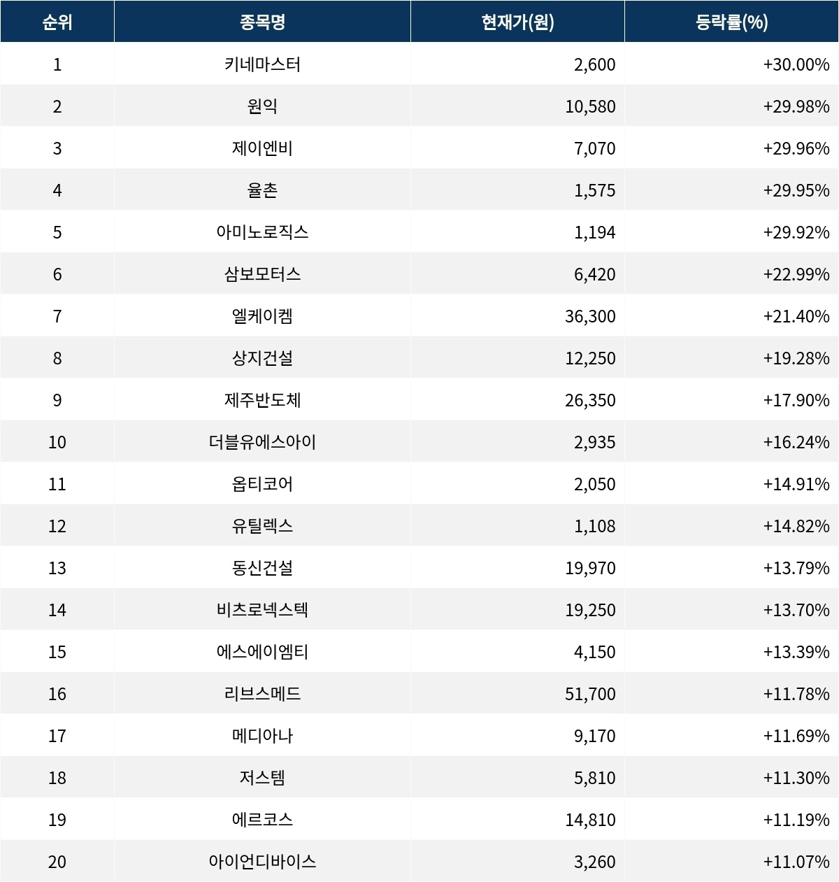 6위 삼보모터스(053700)는 6,420원으로 22.99% 급등 마감했다. 7위 엘케이켐(489500)은 종가 36,300원으로 21.40% 급등 마감했다. 8위 상지건설(042940)은 종가 12,250원으로 19.28% 급등 마감했다. 9위 제주반도체(080220)는 26,350원으로 17.90% 급등 마감했다. 10위 더블유에스아이(299170)는 2,935원으로 16.24% 급등 마감했다.