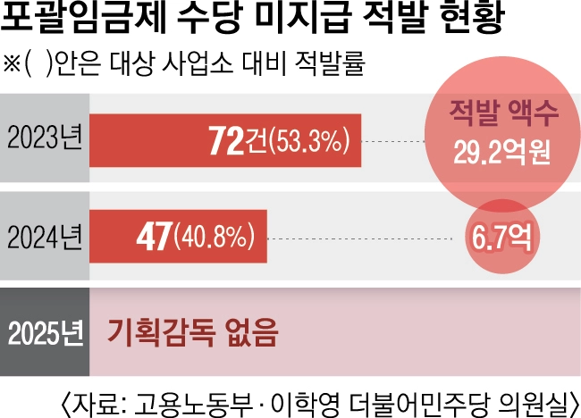 31일 서울신문이 이학영 더불어민주당 의원실을 통해 확보한 자료에 따르면, 2023년 포괄임금제 오남용 기획감독은 135개 사업장을 대상으로 실시돼 72곳이 적발됐다. 미지급 수당은 29억 2000만원에 달했다. 2024년에도 115개 사업장을 감독해 47곳을 적발, 6억 7000만원의 체불 수당이 확인됐다.