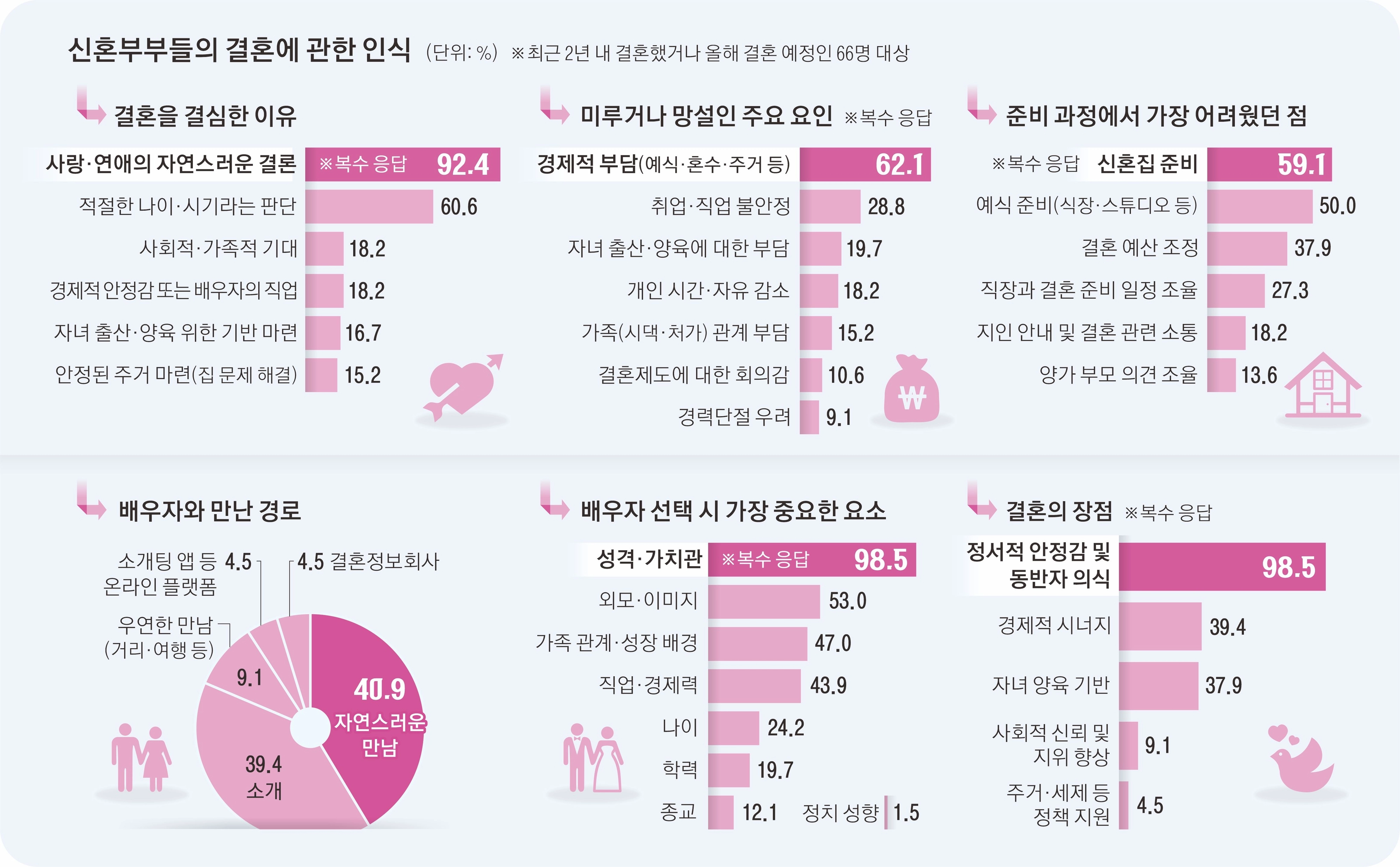 예비·신혼부부 66쌍 설문조사다시 결혼의 봄바람이 분다. 몇 년째 이어지던 ‘비혼주의’ 추세가 한풀 꺾이고 혼인 대열에 합류하는 사람들이 늘고 있다. 2012년부터 11년째 줄어들던 혼인 건수는 2023년 반등해 3년 연속 상승세다. 주말마다 전국 곳곳의 예식장과 웨딩 촬영 명소는 예비 부부들로 붐비고, 드레스와 예물 등 웨딩 관련 업체에도 예약 문의가 끊이질 않는다. 코로나 팬데믹의 여파로 급감했던 혼인 건수가 회복된 ‘기저 효과’라는 분석도 있다. 하지만 결혼 적령기 청년들 사이에서는 결혼 자체에 대한 인식이 우호적으로 바뀌었다는 목소리를 확인할 수 있었다. ‘결혼 붐’이 시작된 지금 신혼 및 예비 부부들의 목소리를 통해 비슷한 듯 달라진 결혼 인식과 문화를 들여다봤다. 출산·양육 등 결혼 이후의 삶과 더 많은 이들이 가정을 이룰 수 있는 혼인 선진국으로 가는 방안을 살펴본다.