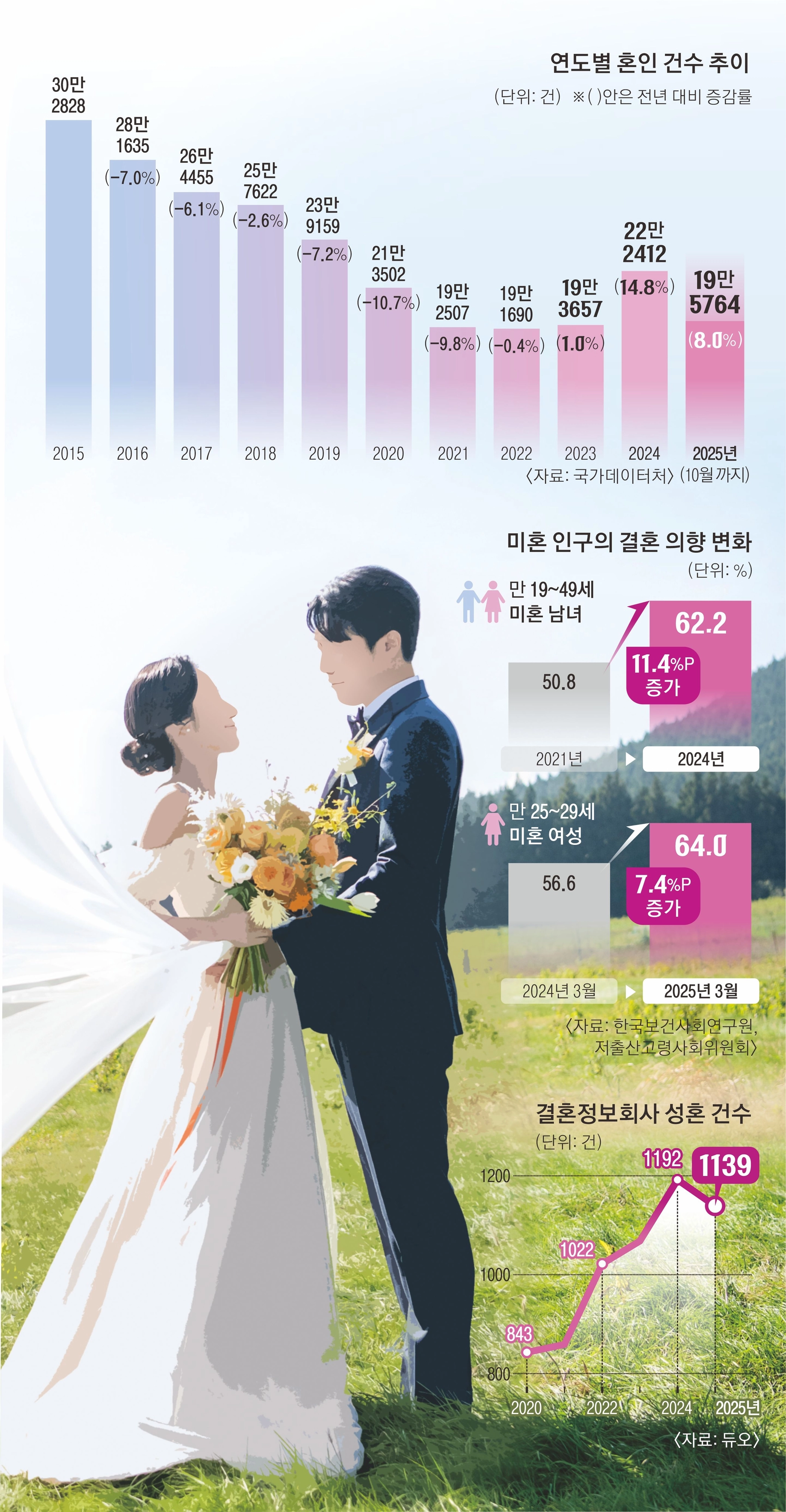 민간 통계에서도 유사한 흐름이 발견된다. 결혼정보회사 ‘듀오’에 따르면 성혼 건수는 2024년 1192건으로 역대 최고치를 달성했다. 2020년(843건) 최저 수준을 찍은 이후 4년 연속 올랐다. 지난해 성혼 건수도 1159건으로 2024년에 이어 두 번째로 높은 수치다. 듀오 관계자는 “결혼을 진지하게 고려해 가입하는 고객이 늘고 있다”며 “비교적 이른 시점부터 자신의 결혼 조건과 방향성을 점검하고 준비하려는 경향이 크다”고 설명했다.