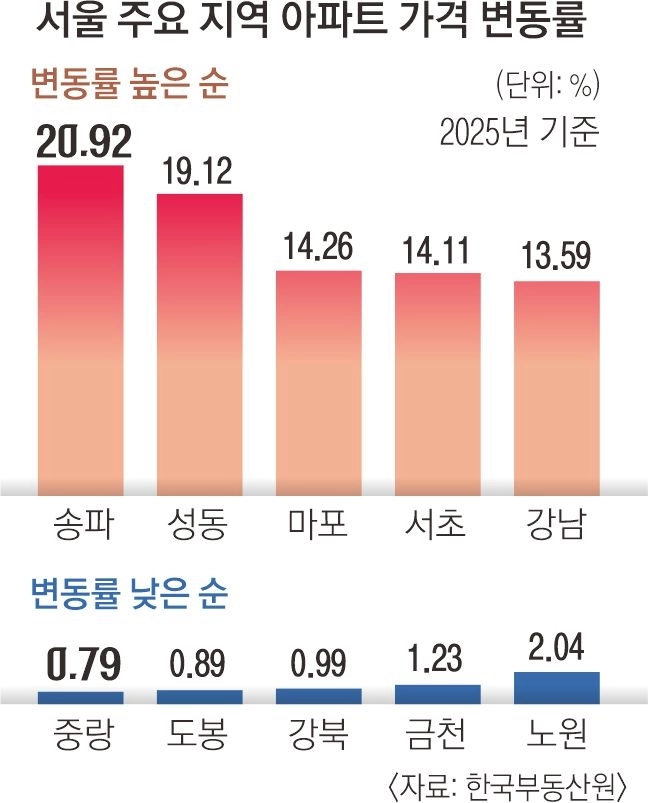 2025년 연간으로 보면 서울 아파트 평균 매매가는 지난해 연간 8.71% 올라 아파트값이 급등하던 문재인 정부 당시 2018년(8.03%)과 2021년(8.02%)의 수준을 훌쩍 넘었다. 전국에서 지난해 가장 아파트값이 많이 오른 지역은 서울 송파구(20.92%)였고 경기 과천시(20.46%), 서울 성동구(19.12%), 경기 성남시 분당구(19.10%) 등이 뒤를 이었다.