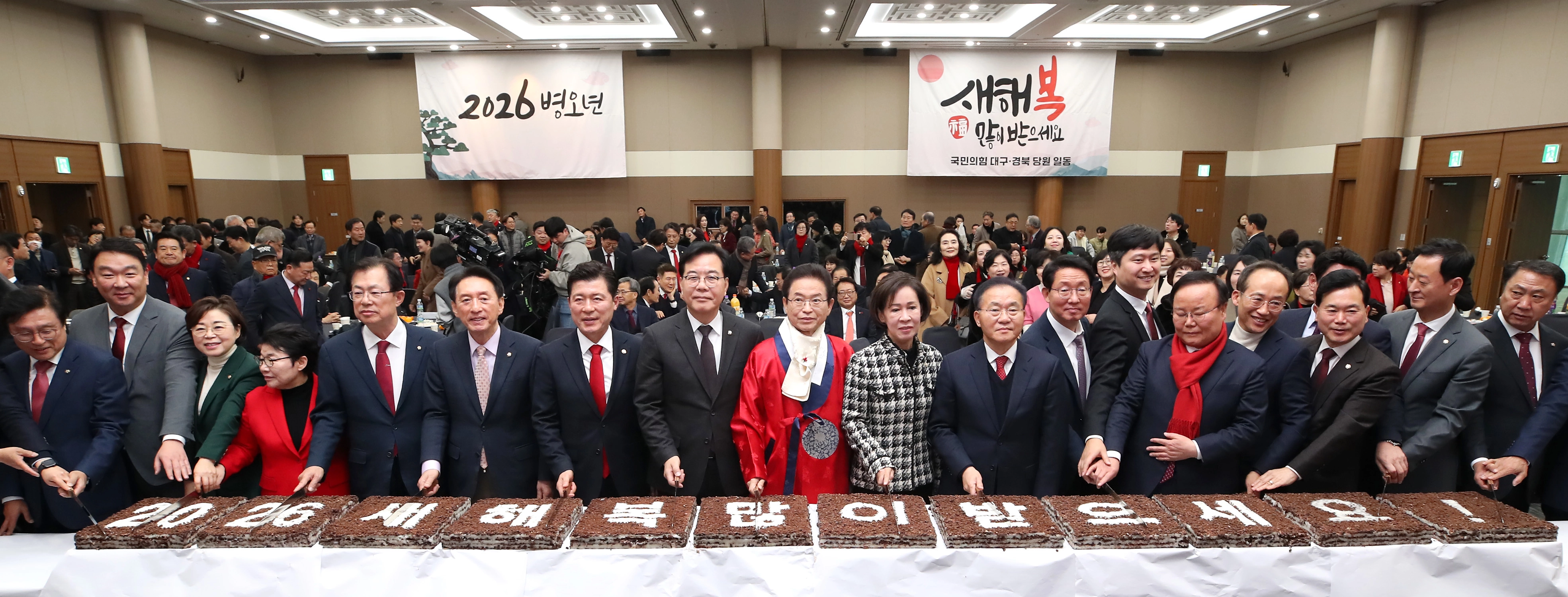 (대구=뉴스1) 공정식 기자 = 2일 오후 대구 북구 엑스코(EXCO)에서 열린 ‘2026 국민의힘 대구·경북 신년인사회’에서 송언석 원내대표를 비롯한 참석자들이 새해 만복을 기원하며 떡케이크를 자르고 있다. 2026.1.2/뉴스1
