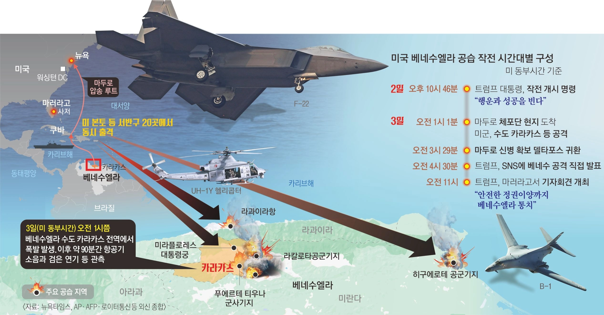 도널드 트럼프 미국 대통령이 2일(현지시간) 오후 10시 46분 작전 실행 최종 명령을 내리자 서반구에 위치한 미 공군기지 20곳에서 항공기들이 일제히 베네수엘라를 향해 출격했다. F-22와 F-18, E/A-18, F-35 등 첨단 전투기를 비롯해 B-1 폭격기, E-2 정찰기, 다수의 원격 조종 드론까지 150여대가 작전에 동원됐다. 미 항공기들은 베네수엘라 방공망을 순식간에 무력화했고, 사이버전을 통해 수도 카라카스 전력을 차단하며 칠흑 같은 어둠을 만들었다.
