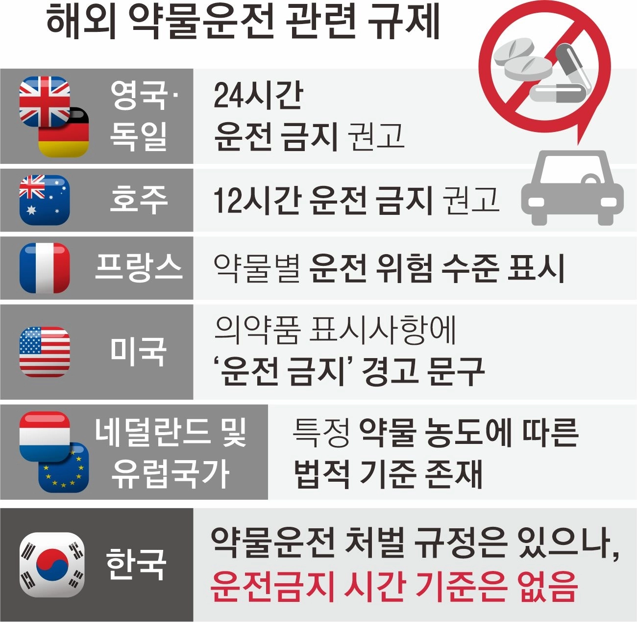 해외 사례를 보면 영국과 독일은 우울증 등 일부 약물을 복용한 뒤 24시간, 호주는 12시간 동안 운전을 금지한다. 프랑스는 약품에 따라 ▲노란색(지장 없음) ▲주황색(주의 필요) ▲빨간색(운전 금지) 등으로 표시한다. 미국은 일부 약물에 운전 금지 경고 문구를 부착하고, 네덜란드 등 일부 유럽 국가는 약물 농도별로 법적 기준을 두고 있다.