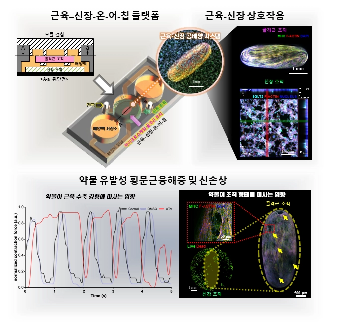 연구팀은 이번에 개발한 칩으로 근육 손상을 유발하는 것으로 알려진 고지혈증 치료제인 아토르바스타틴과 중성지방 치료제인 페노피브레이트를 실험에 적용했다. 그 결과, 칩 위 근육 조직에서는 근육이 힘을 내는 능력이 떨어지고 구조가 망가졌으며, 근육 세포 단백질인 미오글로빈과 근육 효소인 CK-MM 등 근육 손상 정도를 보여주는 물질의 수치가 증가하는 등 횡문근융해증의 전형적 변화가 관찰됐다. 또, 신장 조직에서는 정상적으로 살아 있는 세포 수가 감소하고 세포 사멸이 증가했으며 급성 신장손상이 발생할 때 증가하는 지표가 유의미하게 증가했다. 특히 손상된 근육에서 나온 독성 물질이 신장 손상을 단계적으로 더욱 악화시키는 연쇄적인 손상 과정까지 함께 확인됐다.