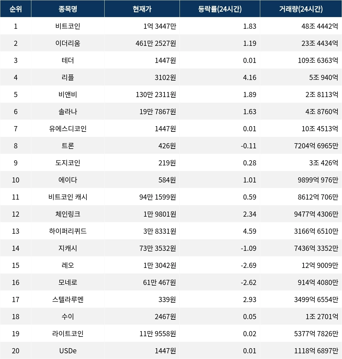 글로벌 가상자산 시황 중계 사이트 코인마켓캡(CoinMarketCap)에 따르면, 비트코인은 현재 1억 3447만 원에 거래되고 있으며, 24시간 동안 1.83% 상승했다. 1시간 등락률은 -0.11%로 잠시 주춤한 모습을 보이고 있지만, 거래량은 48조 4442억 원으로 여전히 활발하다. 이더리움은 461만 2527원에 거래되고 있으며, 24시간 동안 1.19% 상승했다. 1시간 등락률은 -0.18%로 조금 하락했으나, 거래량은 23조 4434억 원이다. 리플은 3102원에 거래되고 있으며, 24시간 동안 4.16% 상승했다. 1시간 등락률은 -0.04%로 소폭 하락했지만 강한 상승세를 유지하고 있으며, 거래량은 5조 940억 원이다.