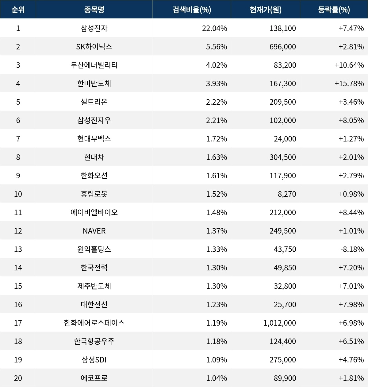 이어 검색비율 2위의 SK하이닉스(000660)는 상승률 2.81%로 상승 마감했다. 검색비율 3위의 두산에너빌리티(034020)는 10.64% 상승 마감했다. 검색비율 4위 한미반도체(042700)는 급등률 15.78%를 기록했다. 검색비율 5위 셀트리온(068270)은 3.46% 상승 마감했다.