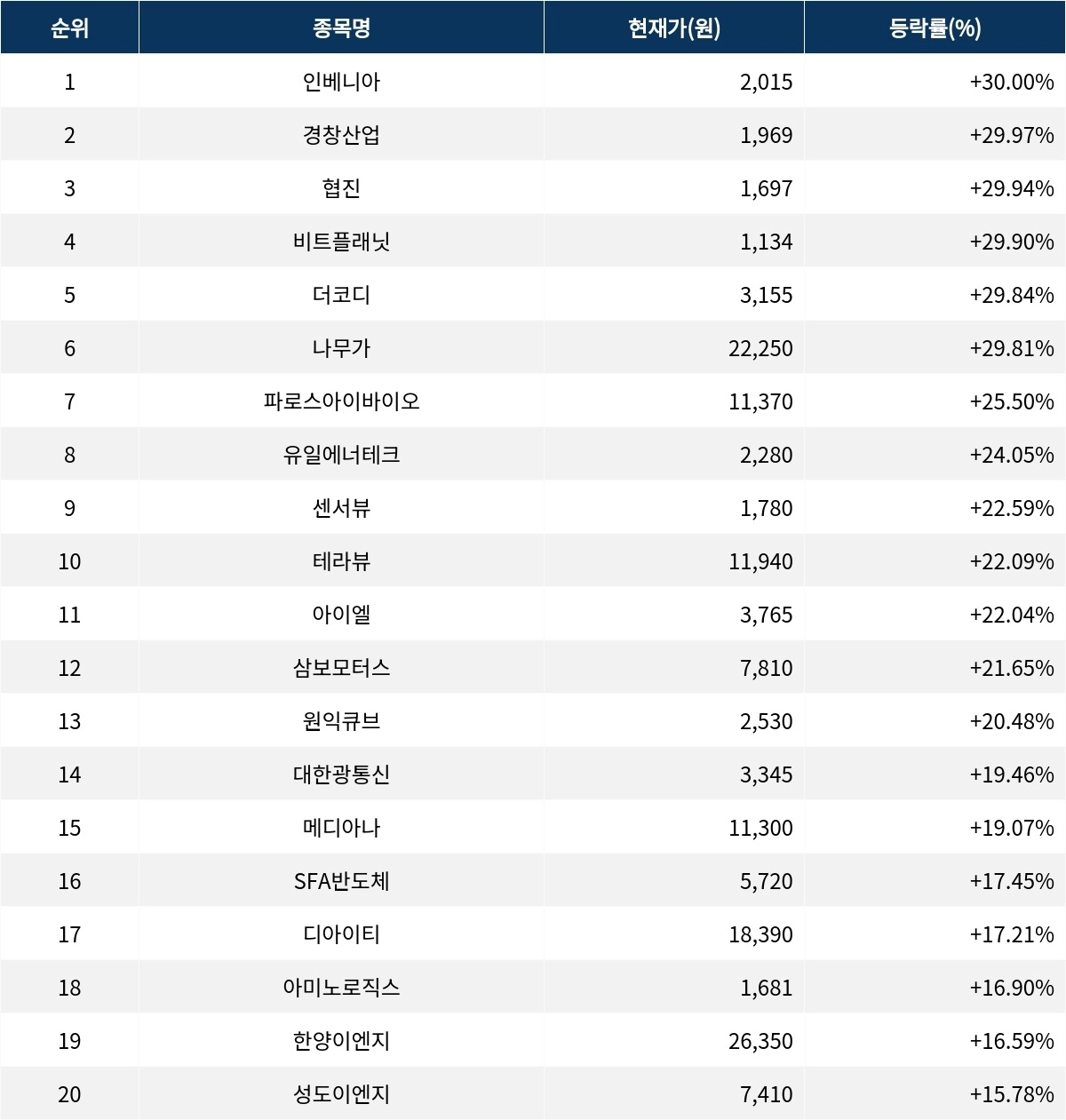 [서울데이터랩]인베니아 30.00% 상한가…금일 증시 상승률 1위로 마감