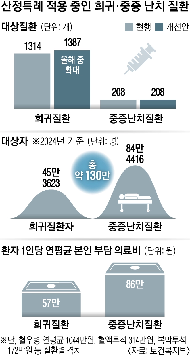 산정특례 적용 대상인 희귀·중증난치질환자는 전국에 약 130만명 수준이다. 연평균 본인부담 의료비는 희귀질환 57만원, 중증난치질환 86만원 수준이지만 질환별 격차가 크다. 혈우병 환자는 연평균 1044만원을 부담하고, 혈액투석은 314만원, 복막투석은 172만원에 이른다. 산정특례 적용 희귀질환은 올해 70개가 추가돼 1387개로 늘어나고, 중증난치질환은 208개다.