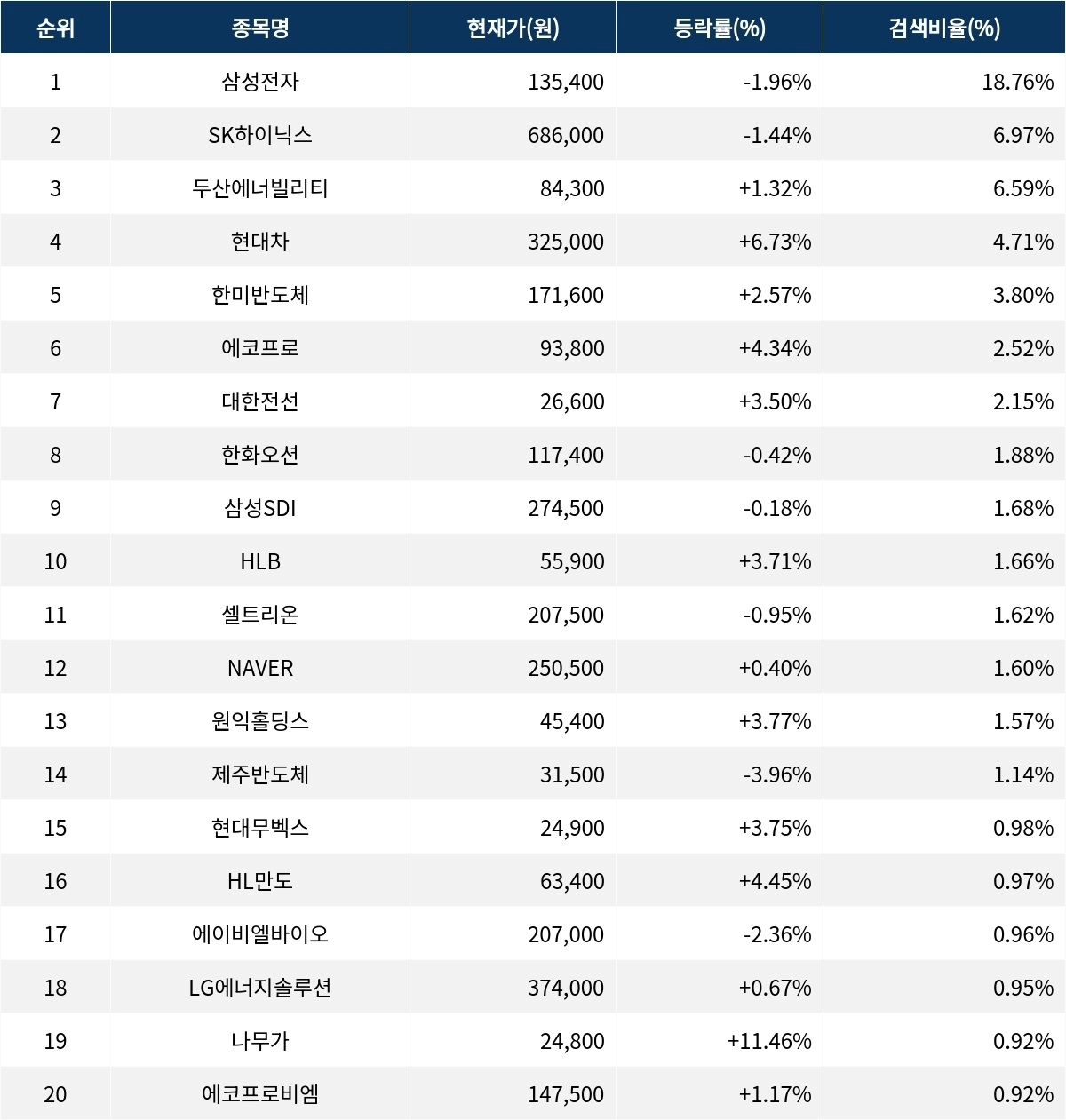 이어 SK하이닉스(000660)가 검색비율 2위를 기록하며 1.44%의 하락세를 기록하고 있다. 검색비율 3위의 두산에너빌리티(034020)는 1.32% 상승하며 순조롭게 출발하는 모습이다. 검색비율 4위 현대차(005380)는 개장 초반부터 6.73%의 상승률을 보이며 강세를 보이고 있다. 검색비율 5위 한미반도체(042700)는 2.57% 상승하고 있다.