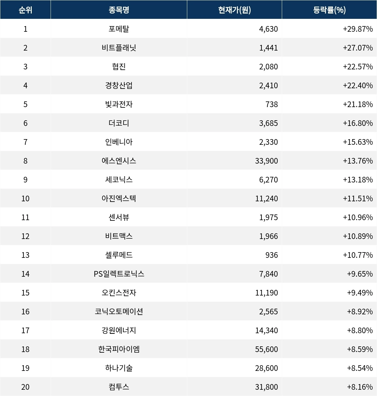 포메탈이 상승률 1위를 기록한 등락률은?