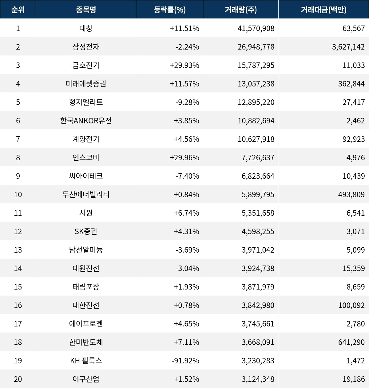 금호전기(001210)는 712원으로 상한가를 기록하며 15,787,295주가 거래되고 있다. 미래에셋증권(006800)은 28,450원으로 11.57% 상승, 거래량 13,057,238주로 상위권에 위치하고 있다. 형지엘리트(093240)는 2,005원으로 9.28% 하락하며, 한국ANKOR유전(152550)은 216원으로 3.85% 상승 중이다. 계양전기(012200)는 8,260원으로 4.56% 상승, 인스코비(006490)는 694원으로 상한가를 기록하고 있다. 씨아이테크(004920)는 1,339원으로 7.40% 하락, 두산에너빌리티(034020)는 83,900원으로 0.84% 상승세다.