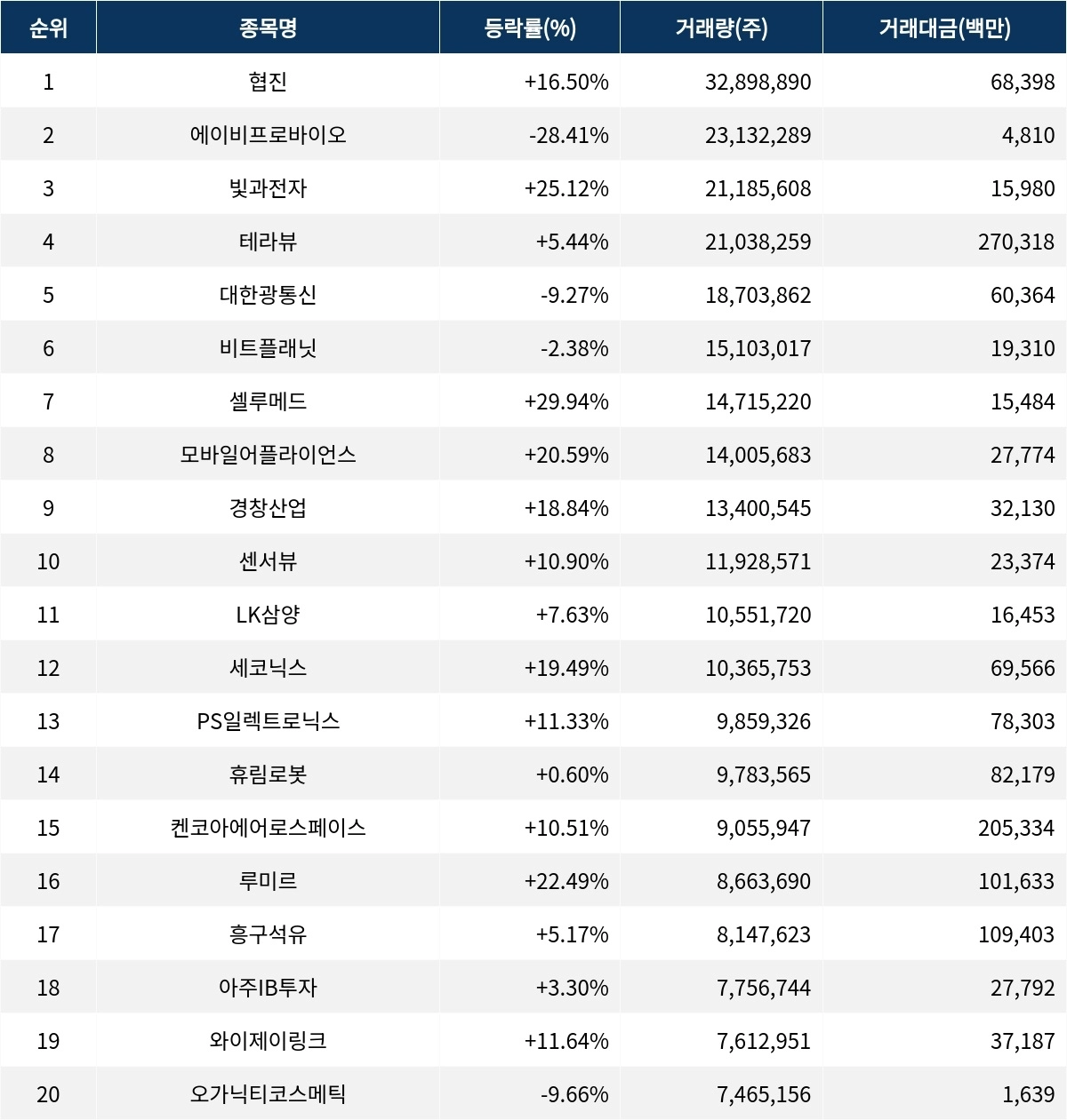 한편 거래량 상위 20위권 종목들은 LK삼양(225190) ▲7.63%, 세코닉스(053450) ▲19.49%, PS일렉트로닉스(332570) ▲11.33%, 휴림로봇(090710) ▲0.60%, 켄코아에어로스페이스(274090) ▲10.51%, 루미르(474170) ▲22.49%, 흥구석유(024060) ▲5.17%, 아주IB투자(027360) ▲3.30%, 와이제이링크(209640) ▲11.64%, 오가닉티코스메틱(900300) ▼9.66% 등의 성적을 기록했다.