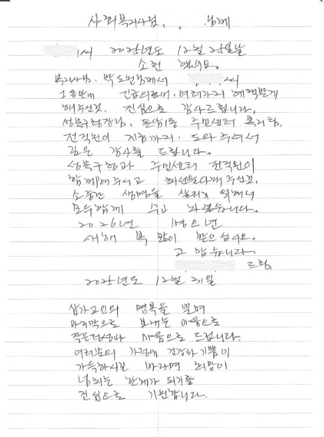지난해 12월 31일 서울 성북구 돈암1동주민센터에 전달된 편지 내용이다. 성북구는 아픈 배우자를 돌보며 경제·행정적 어려움을 겪던 A씨가 의료·복지 지원을 받은 데 대한 감사의 마음을 전해왔다고 6일 밝혔다.