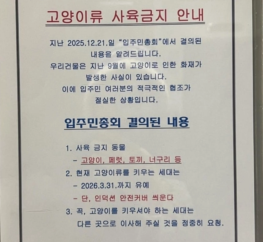 또한 “고양이류를 키우는 세대는 인덕션 안전 커버를 씌워야 한다”며 “꼭 고양이를 키워야 하는 세대는 다른 곳으로 이사할 것을 정중히 요청한다”고 공지했다.