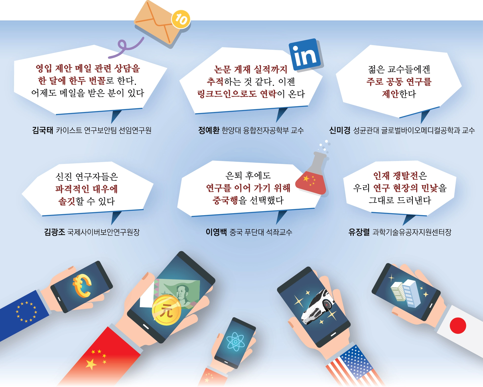 연구 보안 업무를 담당하는 김국태 카이스트 선임연구원은 “지난달에도 한 교수가 영입 제안 메일을 받아서 연구보안팀에 문의했다”고 전했다. 한 공과대학 교수도 “동료 교수들끼리 모이면 해외에서 영입 제안이 온 경험을 공유하는 일이 많다”고 했다.