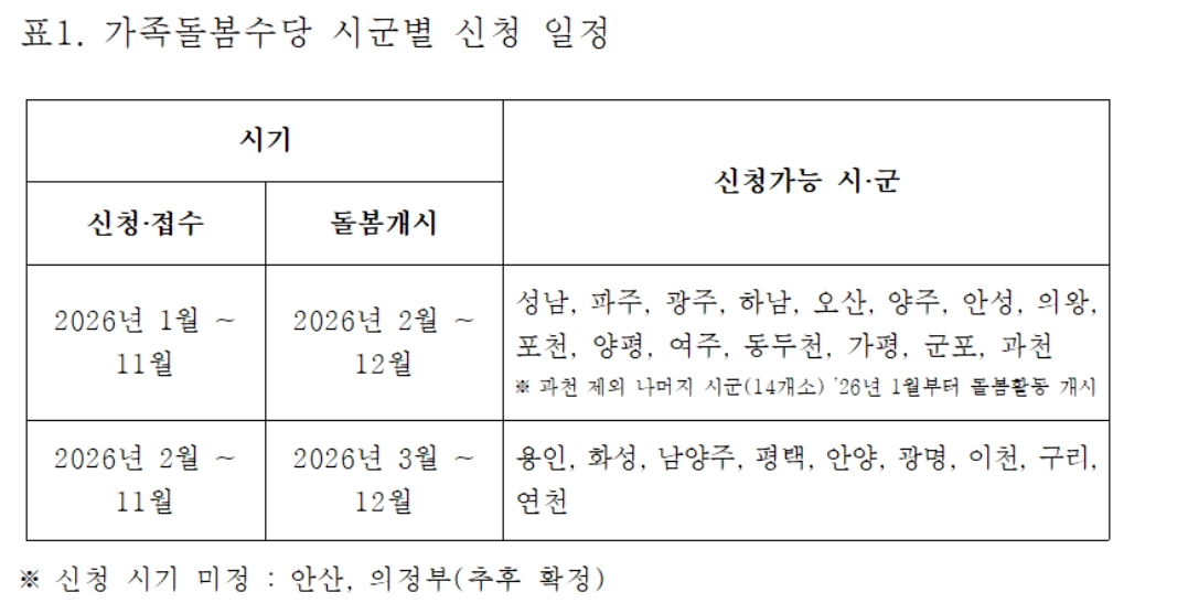 신청은 매월 1일부터 15일까지 경기민원24(gg24.gg.go.kr)를 통해 온라인으로 가능하며, 돌봄 활동 후 다음 달에 수당이 지급된다.
