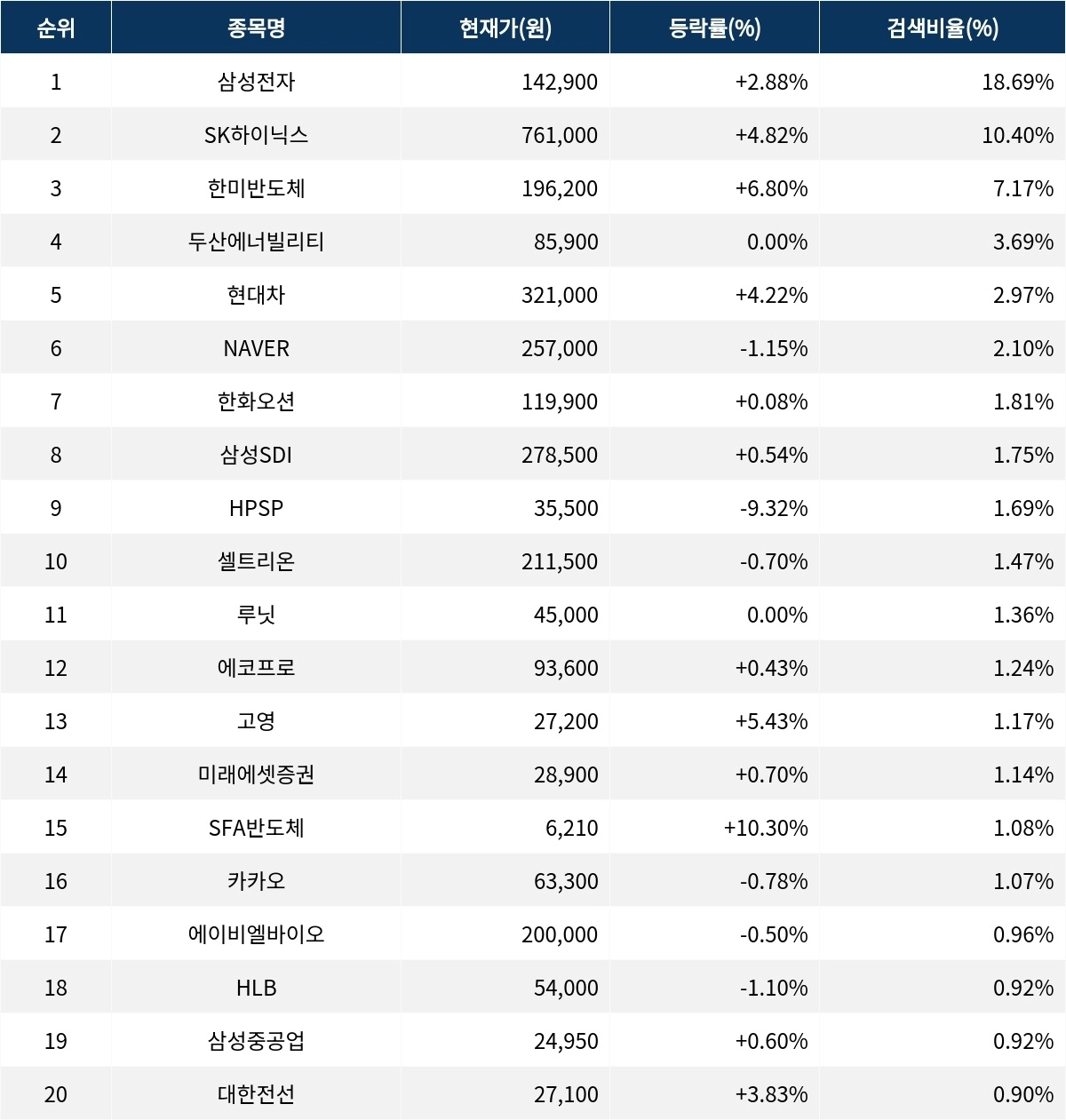 이어 SK하이닉스(000660)가 검색비율 2위를 기록하며 4.82%의 상승세를 기록하고 있다. 검색비율 3위의 한미반도체(042700)는 6.80% 상승하며 순조롭게 출발하는 모습이다. 검색비율 4위 두산에너빌리티(034020)는 개장 초반부터 등락률 0.00%로 보합권에 머물고 있다. 검색비율 5위 현대차(005380)는 4.22% 상승하며 주가가 오르고 있다.
