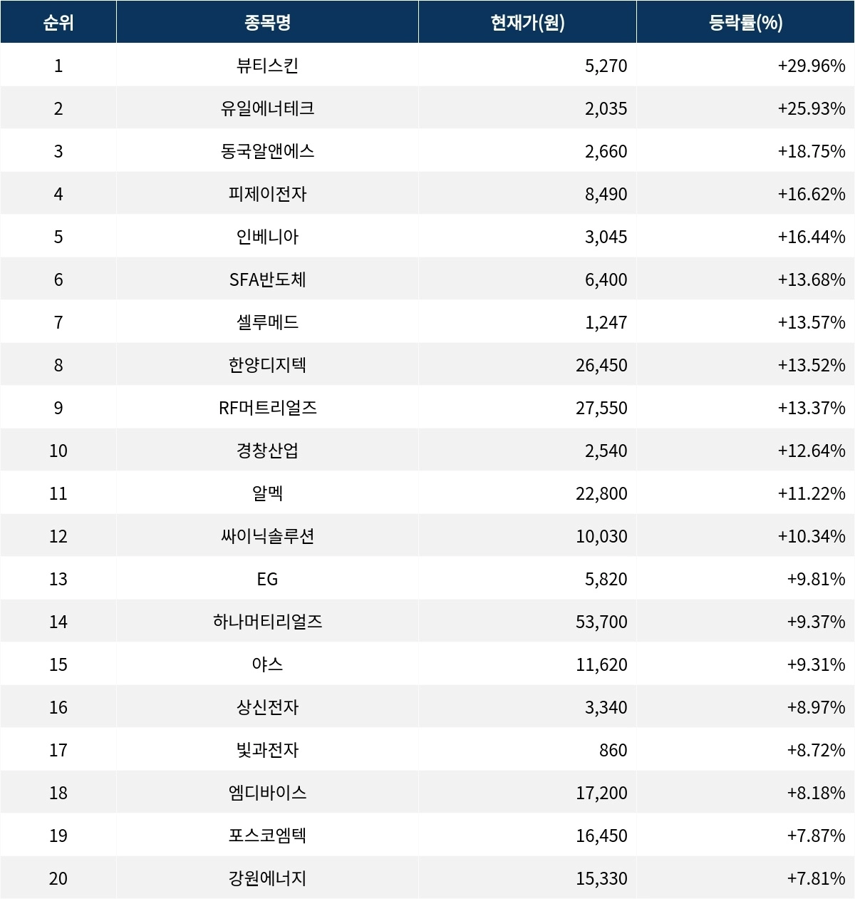 이밖에도 알멕(354320) ▲11.22%, 싸이닉솔루션(234030) ▲10.34%, EG(037370) ▲9.81%, 하나머티리얼즈(166090) ▲9.37%, 야스(255440) ▲9.31%, 상신전자(263810) ▲8.97%, 빛과전자(069540) ▲8.72%, 엠디바이스(226590) ▲8.18%, 포스코엠텍(009520) ▲7.87%, 강원에너지(114190) ▲7.81% 등을 기록하며 시장에서 활발히 거래되고 있다.