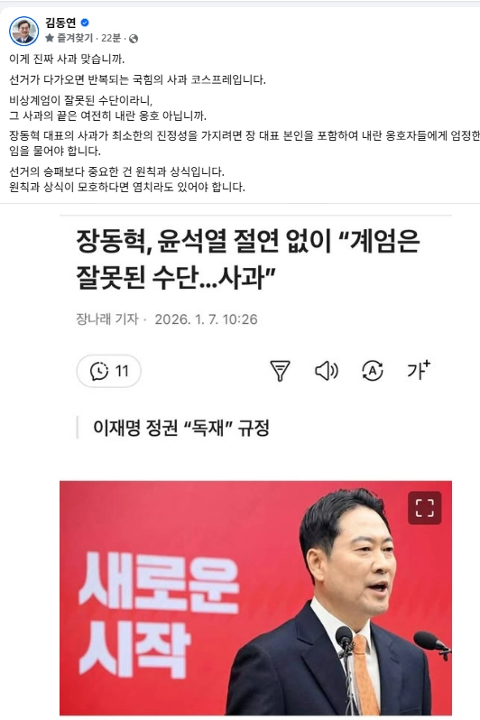 김 지사는 7일 자신의 사회관계망서비스(SNS)에 장 대표가 비상계엄에 대해 사과한 것과 관련해 “이게 진짜 사과 맞습니까. 선거가 다가오면 반복되는 국힘의 사과 코스프레”라고 적었다.