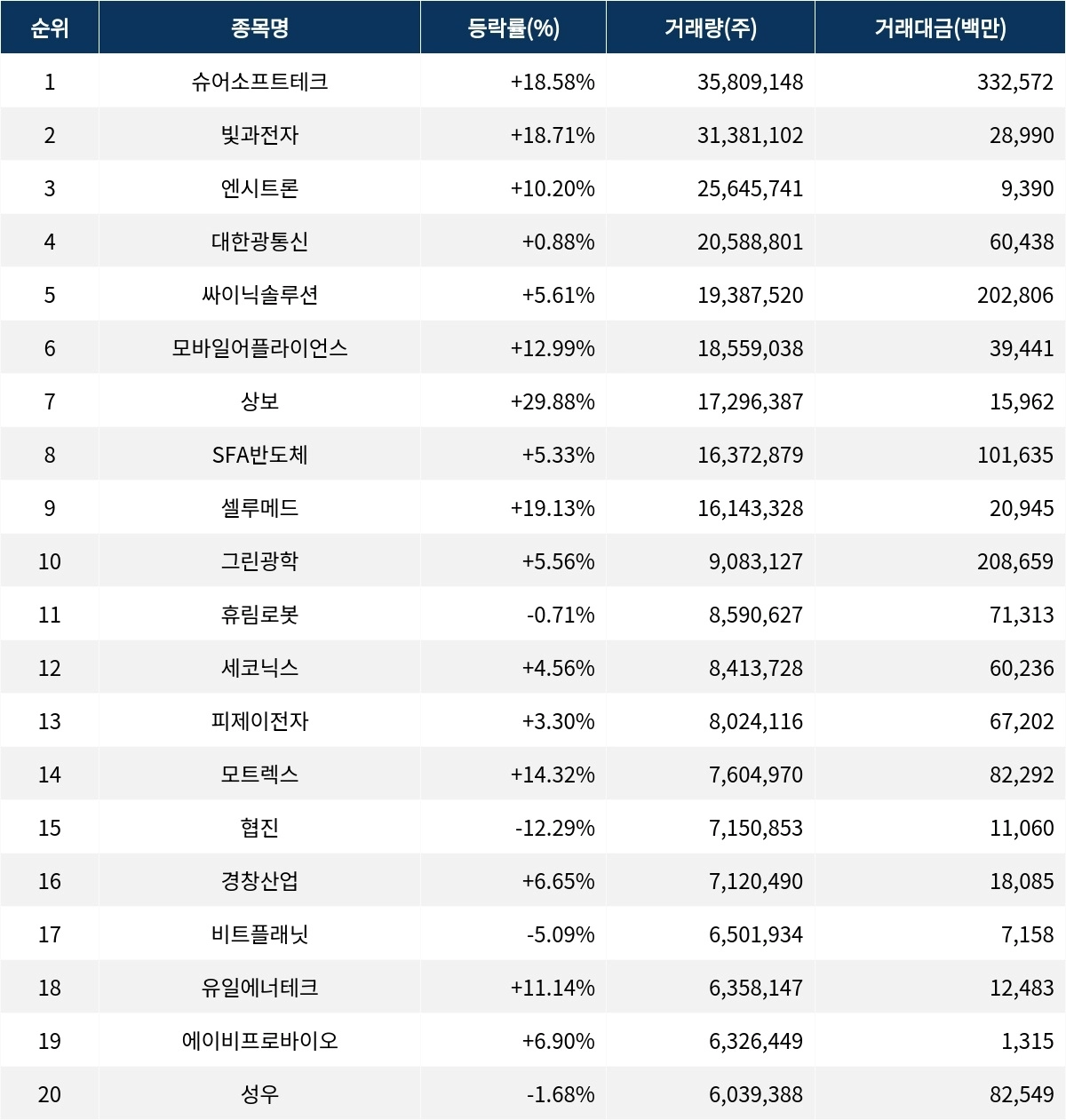 한편 거래량 상위 20위권 종목들은 휴림로봇(090710) ▼0.71%, 세코닉스(053450) ▲4.56%, 피제이전자(006140) ▲3.30%, 모트렉스(118990) ▲14.32%, 협진(138360) ▼12.29%, 경창산업(024910) ▲6.65%, 비트플래닛(049470) ▼5.09%, 유일에너테크(340930) ▲11.14%, 에이비프로바이오(195990) ▲6.90%, 성우(458650) ▼1.68% 등의 성적을 기록하고 있다.