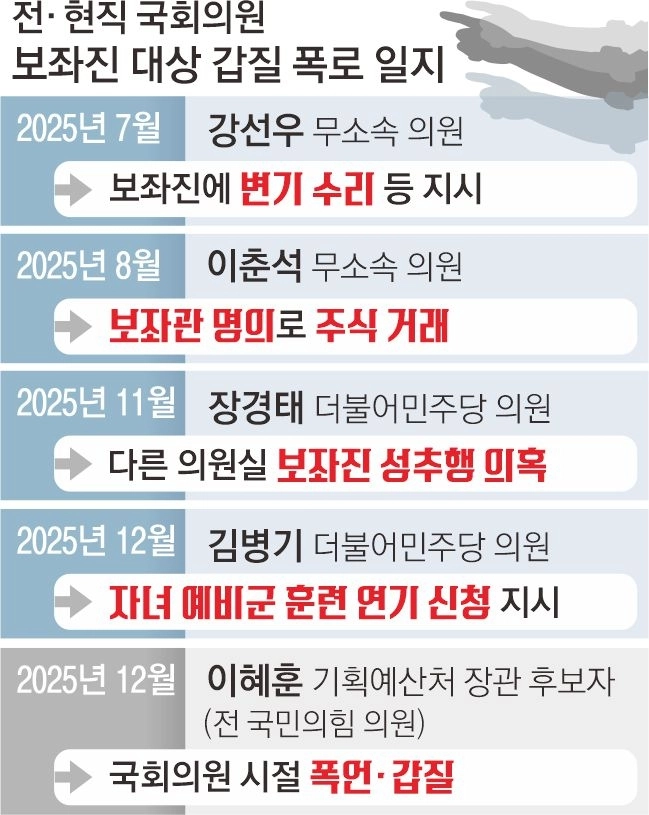 지난해 7월에는 강선우 무소속 의원이 보좌진에게 자택 쓰레기 분리수거와 변기 비데 수리 등 사적인 업무를 지시했다는 의혹이 제기됐다. 8월에는 이춘석 무소속 의원이 보좌진의 주식 계좌를 빌렸다가 적발됐고, 11월에는 장경태 더불어민주당 의원이 다른 의원실 보좌진을 성추행한 혐의로 고소당했다.